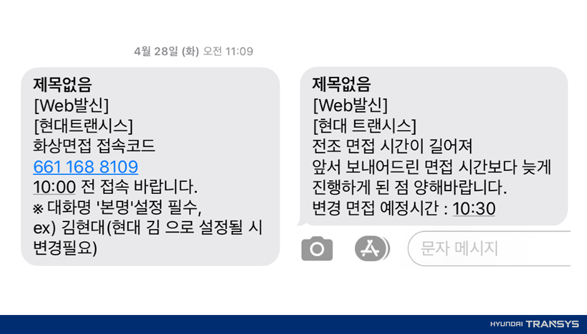 면접 에피소드를 하나 말씀드리자면, 현대트랜시스 최종 면접이 화상면접으로 오전 10시에 잡혔었습니다. 하지만 저의 낡은 휴대폰이 안내문자 접속코드를 11시가 넘어 수신된 최대 위기가 발생했죠. 저는 허겁지겁 포털사이트에 현대트랜시스를 검색하여 나오는 전화번호에 전화를 걸었지만 그곳은 면접과 전혀 상관없는 성연공장 경비실이었습니다. 다행히도 경비실에서 인사팀 전화번호를 알려주셨고, 우여곡절 끝에 화상면접 1분 전에 접속하여 경쟁자들을 물리치고 지금 이 자리에 있게 되었습니다.