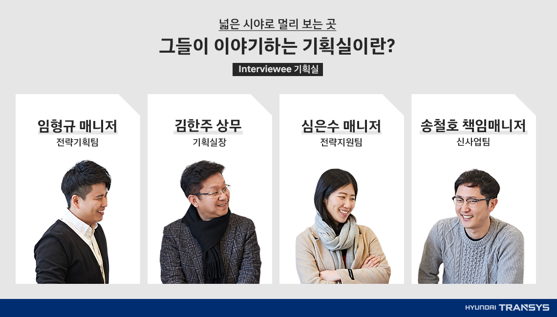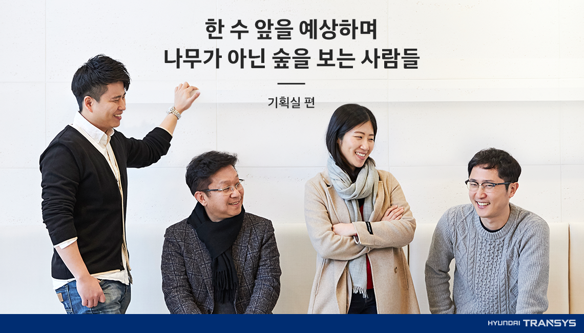 ‘신의 한 수’ 라는 말이 있죠. 먼 앞을 내다본 행동이 딱 맞아떨어지는 상황을 일컫는 말입니다. 현대트랜시스에서는 바로 이들을 보고 ‘신의 한 수’라고 이야기할 수 있겠습니다. 한 수 앞을 예상하고 나무가 아닌 숲을 보며 끊임없이 전략과 기획을 수립하는 팀! 바로 현대트랜시스의 ‘기획실’입니다. 기획실을 이끌어가는 구성원들이 모여 무슨 이야기를 했을까요? 그들만의 소통 방법과 기업 문화를 엿볼 수 있는 인터뷰! 지금 바로 이야기를 들어보겠습니다.