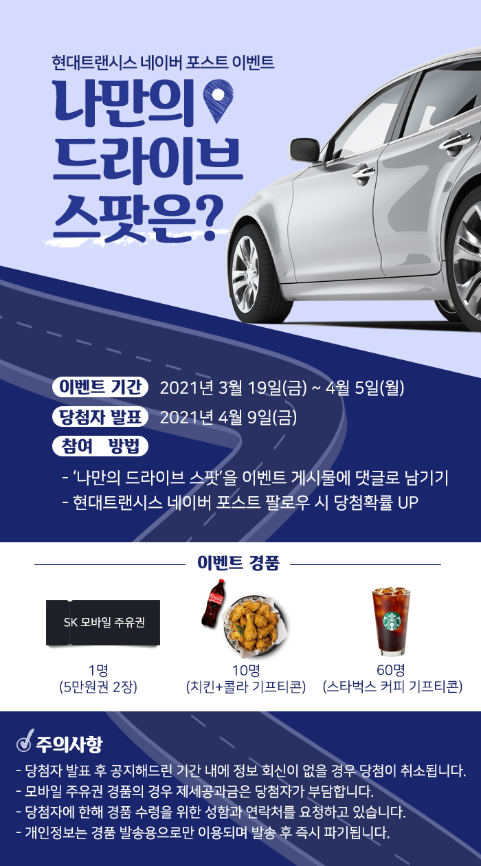 현대트랜시스 네이버 포스트를 팔로우하고, ‘나만의 드라이브 스팟’을 댓글로 남겨주세요. 추첨을 통해 봄 기운 만큼이나 설레는 다양한 경품을 증정하니, 자세한 참여방법은 아래 내용을 확인해주세요.