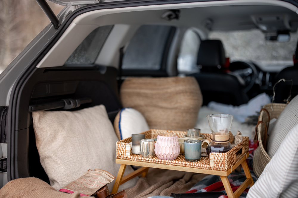차박처럼 차에서 잠까지 자는 것은 아니라 하더라도 차 안에서 간단한 간식도 먹고 커피도 마시고 뷰도 감상하려면 아무래도 차량 뒷좌석을 폴딩을 하고 공간을 여유 있게 사용하는 것이 좋겠죠. 시트와 트렁크 공간이 수평이 되는 차량이 아니라면 박스형 수납함이나 헤드레스트, 에어 매트 등을 활용해 바닥을 수평을 만들면 편안함을 느낄 수 있습니다.
