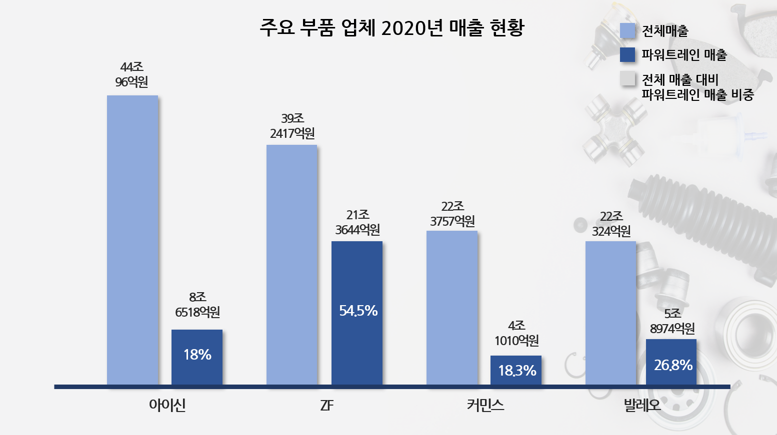 시장조사기업 마켓스앤마켓스는 파워트레인의 글로벌 시장 규모가 2019년 629억 달러에서 연평균 14.9% 성장해 2027년에는 1914억 달러(약 216조원 규모)가 될 것으로 예측했습니다. 매킨지는 2025년까지 글로벌 완성차 판매는 연평균 1.3% 성장하지만, 파워트레인 부품 시장은 완성차보다 두 배 이상 성장할 것으로 분석했죠.