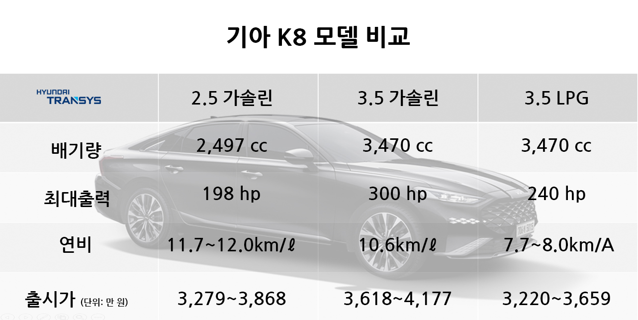 새로운 기아의 첫 모델 K8, 그리고 다양한 파워트레인