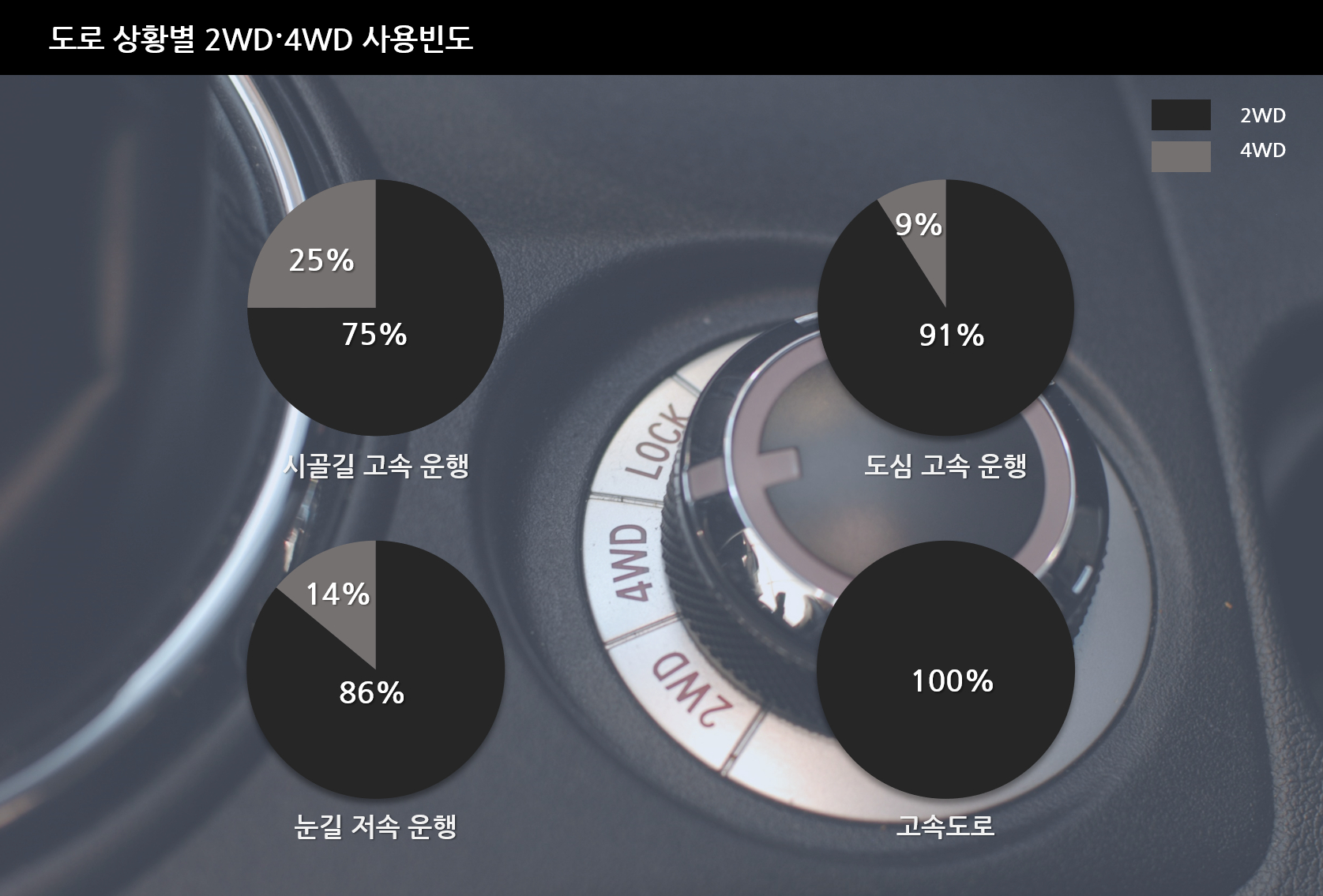 AWD는 2WD보다 주행 성능과 안전성 부분에서 우월합니다. 노면과 바퀴 사이의 접지력이 뛰어나 눈, 비, 가파른 오르막 등반 시 안정적인 주행 능력을 보여주어 안전을 중시하는 운전자에게 필수 옵션입니다.