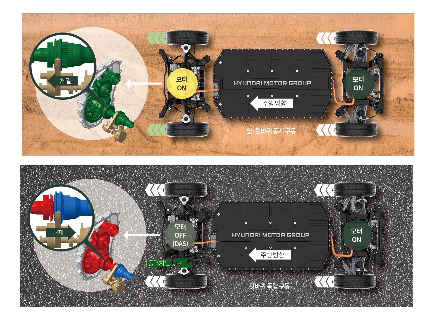 쉽게 말해 전기차의 모터와 구동축을 주행 상황에 따라 분리하거나 연결하는 장치입니다. 전기차의 AWD 시스템은 주구동륜과 보조구동륜으로 구성되는데요. 후륜 기반의 아이오닉 5에서는 후륜 모터가 주구동륜이고 보조구동륜인 전륜 모터는 선택 사항입니다. 이때 디스커넥터 시스템은 전륜 모터와 바퀴 사이의 동력을 끊어주는 역할을 합니다.