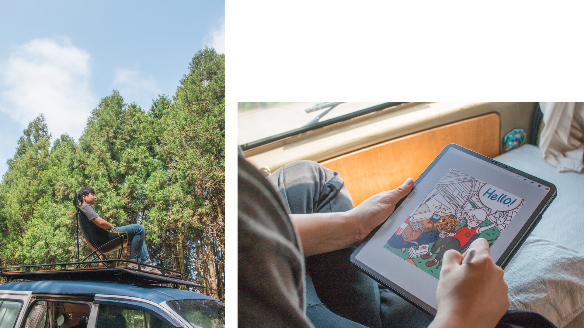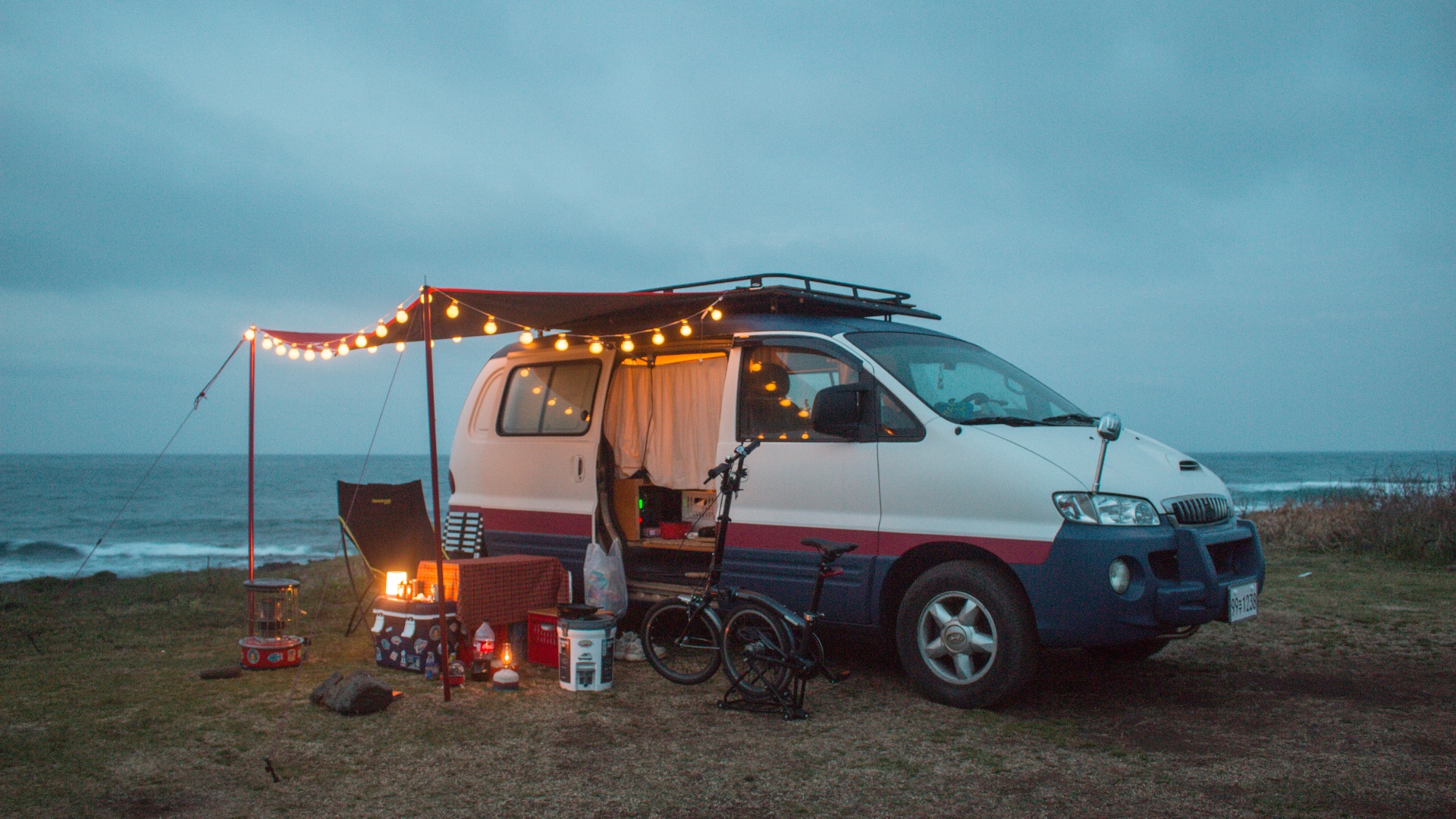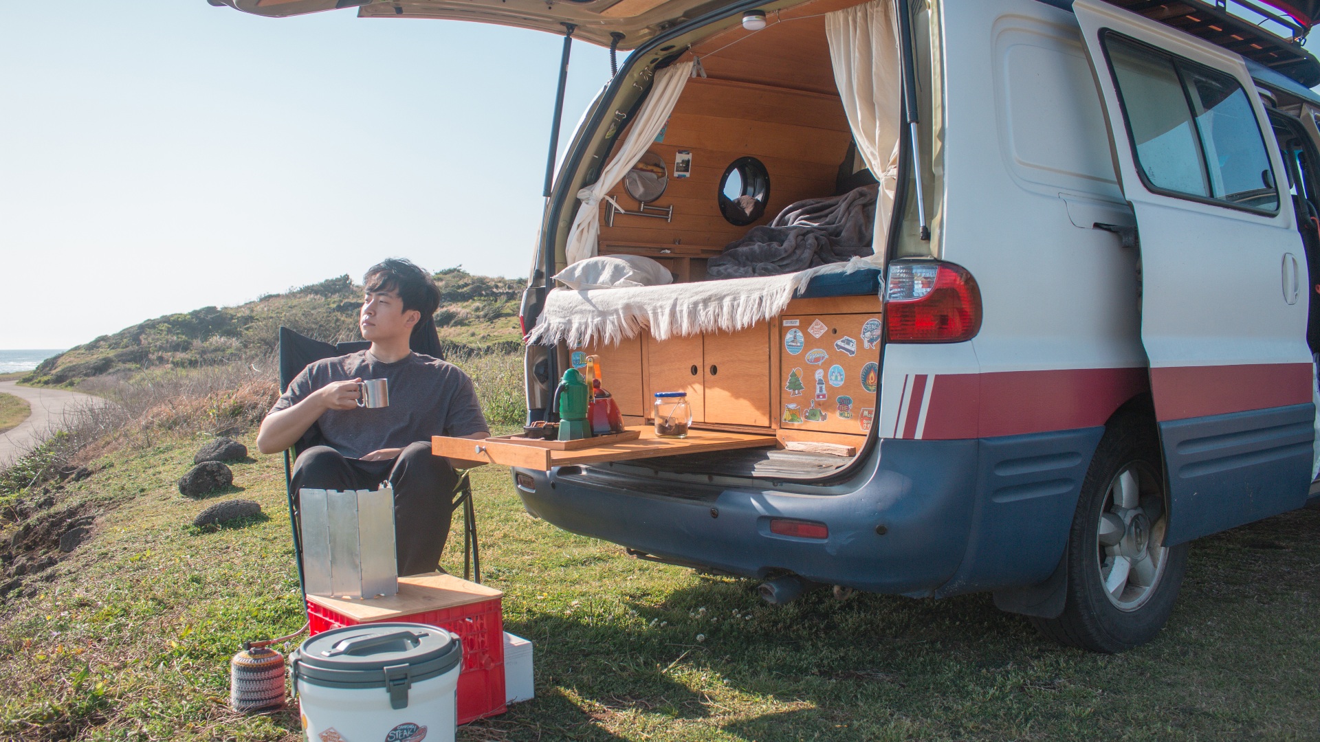 캠핑카를 개조하면서, 누울 수 있는 평상과 그 아래에 캠핑 도구를 싣고 다닌 덕분에 마음에 드는 곳에 차를 세워놓고 뒤로 휙 넘어가 벌러덩 침대에 누워 창밖을 바라보면 어느 뷰맛집 숙소가 부럽지 않죠. 무엇보다, 가고 싶은 노지가 많기 때문에 공간의 제약이 사라진다는 점이 가장 큰 장점이라고 할 수 있죠.