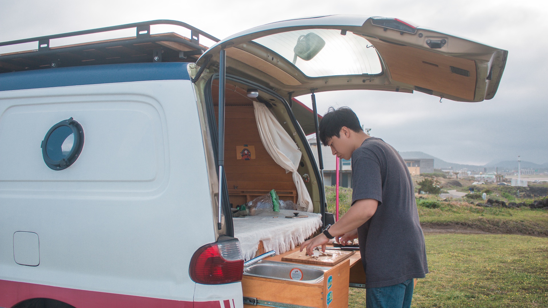 제주를 떠난 지 8년만에 다시 제주로 돌아왔습니다. 그 뒤 2년이 지난 어느 날 마음 속에 품고 있던 나만의 캠핑카 제작 계획을 실천하기 위해 주행거리가 27만km인 2003년식 수동기어 스타렉스를 구입하게 되었습니다. 퇴근 후 시간 날 때 마다 틈틈이 원하는 방식으로 인테리어를 시작했고, 색을 칠했습니다. 마무리로 선박에 쓰이는 동그란 창을 포인트로 달아주면서 나만의 바퀴 달린 집을 완성했습니다.