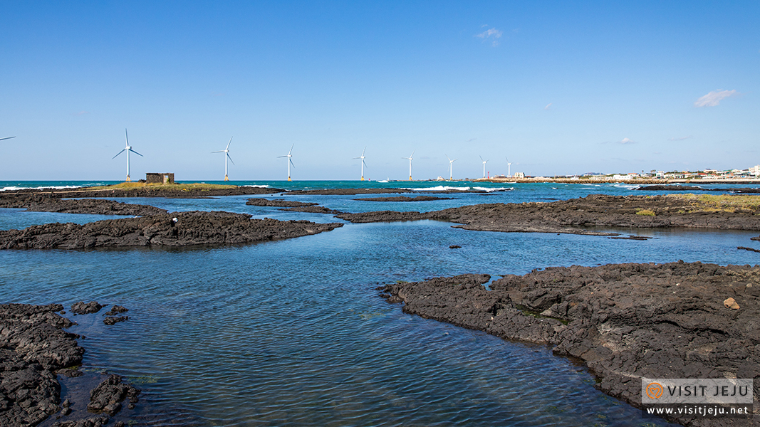 신창풍차해안도로는 제주도 서쪽 끝을 따라 연결된 해안도로로, 해상풍력단지가 조성되어 있어 해안도로를 따라 줄지어 서 있는 풍차를 만날 수 있습니다. 구불구불 해안선을 따라 보이는 하얀 풍차와 에메랄드 바다빛이 환상적인 뷰를 선사해 시원한 바닷바람을 맞으며 경치를 즐길 수 있습니다.