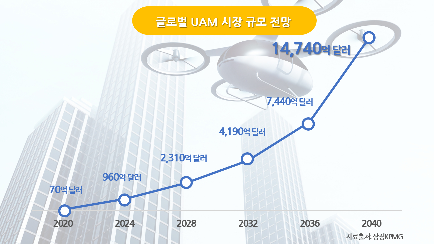 글로벌 투자사들은 UAM 시장의 폭발적 성장을 예상하고 있는데요. 글로벌 투자은행 모건스탠리는 2040년 세계 UAM 시장이 1조 5,000억 달러(약 1853조 원)에 이를 것으로 전망했습니다. 삼정KPMG는 UAM 서비스가 2030년 도심-공항 간 셔틀을 시작으로 2040년 도심 내 항공 택시, 2050년 광역도시 간 이동으로 확장, 2050년 전 세계 이용자 수 4억 4,500만 명으로 예측하고 있습니다.