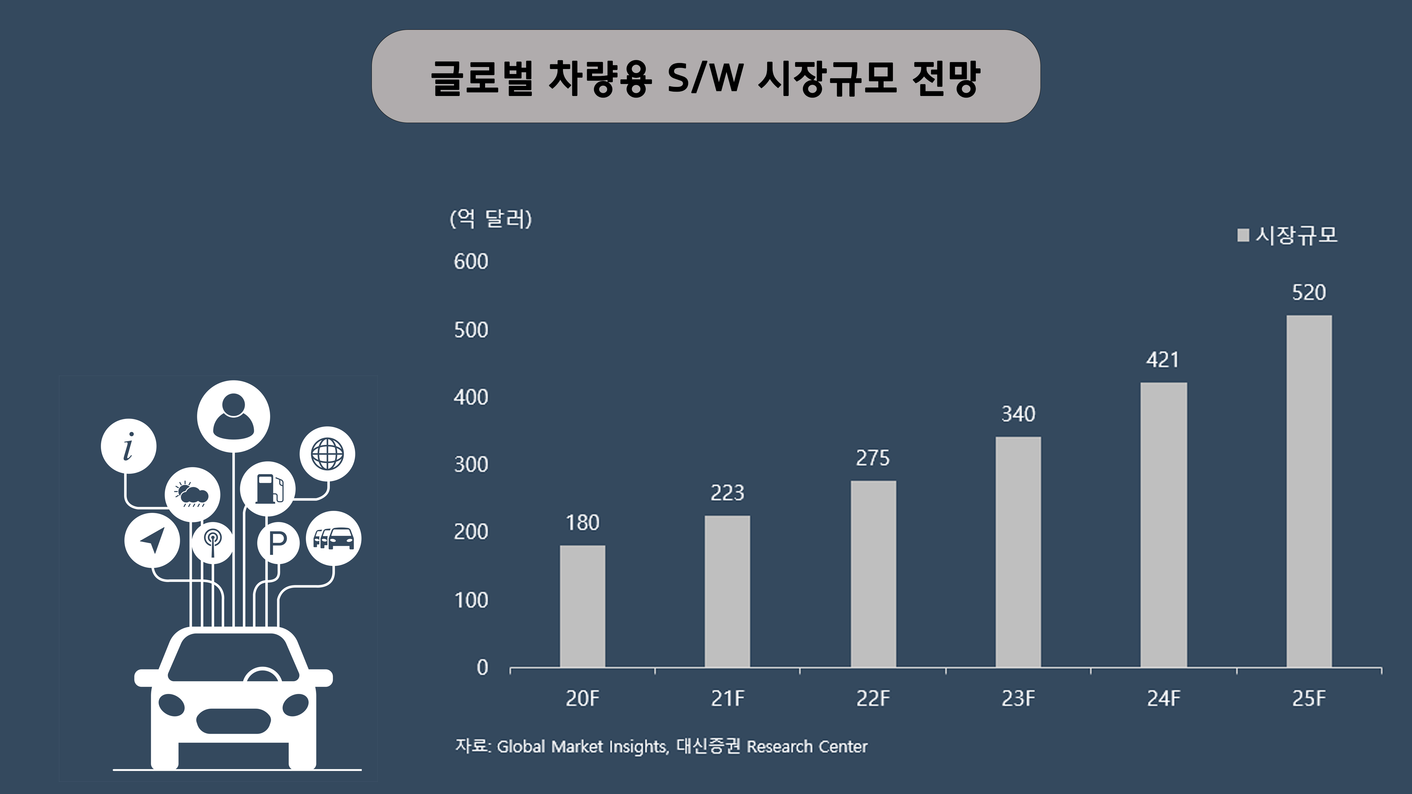 자동차 소프트웨어 시장은 앞으로도 무한 확장될 것으로 예상되는데요, 한국산업기술연구원에 따르면 자동차 하나에 반도체가 2010년 기준 300여 개가 들어갔다면, 자율주행 3단계 이상에서는 약 2,000여 개의 반도체가 들어간다고 합니다. 또한 시장조사업체 글로벌마켓인사이트는 글로벌 차량용 소프트웨어 시장이 지난해 180억 달러(약 19조 8,000억 원)에서 2025년 520억 달러(약 57조 2,000억 원)으로 성장할 것으로 전망하기도 했죠.