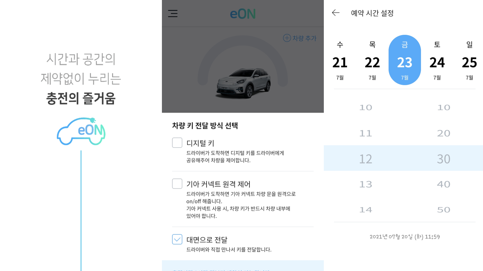 또한 전기차 픽업 충전 서비스를 모바일을 통해 간편하게 이용할 수 있도록 전용 앱인 ‘이온(eON)’도 운영 중입니다. 모바일 앱에 접속해 원하는 날짜와 시간, 차량 픽업 위치, 차량 수령 위치 등을 설정하고 예약을 확정하면 됩니다. 단, 이용 시간의 3시간 전 까지는 반드시 예약이 필요합니다.