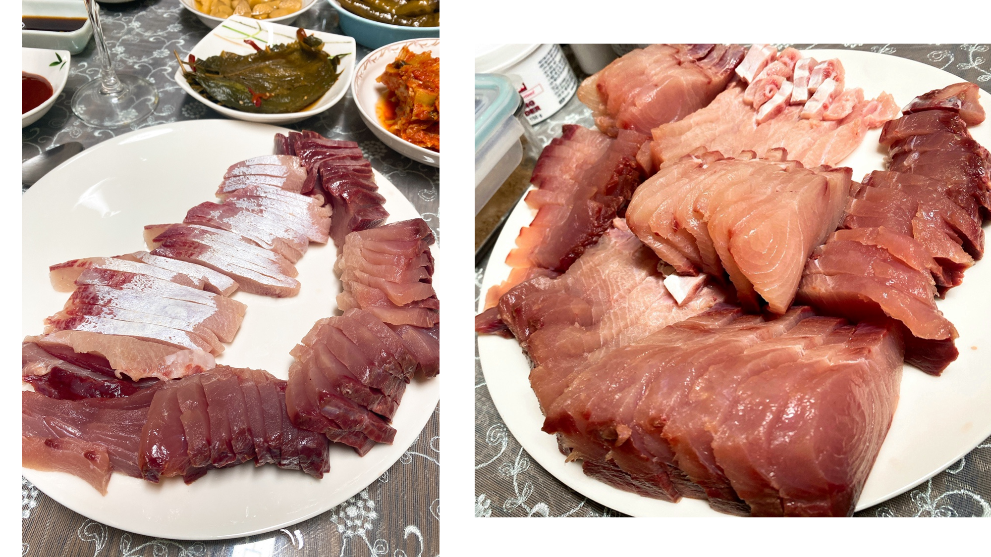 이렇게 잡은 대방어는 껍질과 내장만 벗겨 살코기 덩어리 채로 아이스박스에 담아 처갓집으로 향했습니다. 회를 손질하는 와중에도 고기가 나오는 양을 보고 깜짝 놀랐죠. 소고기 덩어리를 연상시키는 비주얼에 마음이 뿌듯했습니다. 특히 회를 손질해주시는 분이 횟집에서 사 먹으려면 30만 원어치라고 칭찬하셨죠. 포항에서 수원까지 무려 7시간이나 걸렸지만, 힘든 줄 몰랐습니다.