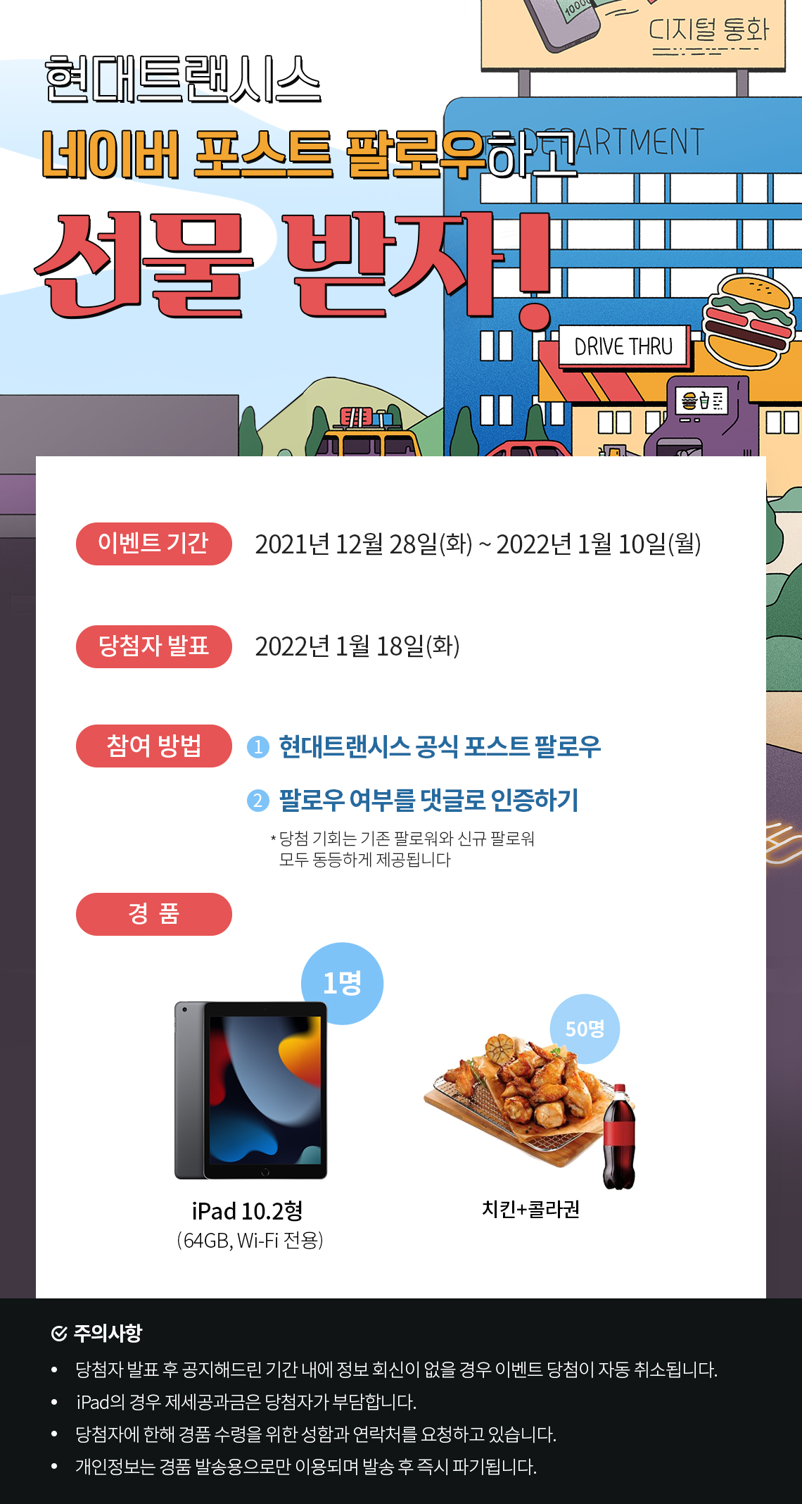 연말을 맞아 한 해 동안 현대트랜시스를 방문해주신 모든 분들께 감사의 말을 전하고자 특별한 이벤트를 준비했습니다. 현대트랜시스 공식 네이버 포스트 팔로우하시고 푸짐한 선물도 받아 가시길 바라며, 내년에도 더욱 유익하고 알찬 정보로 돌아오겠습니다.