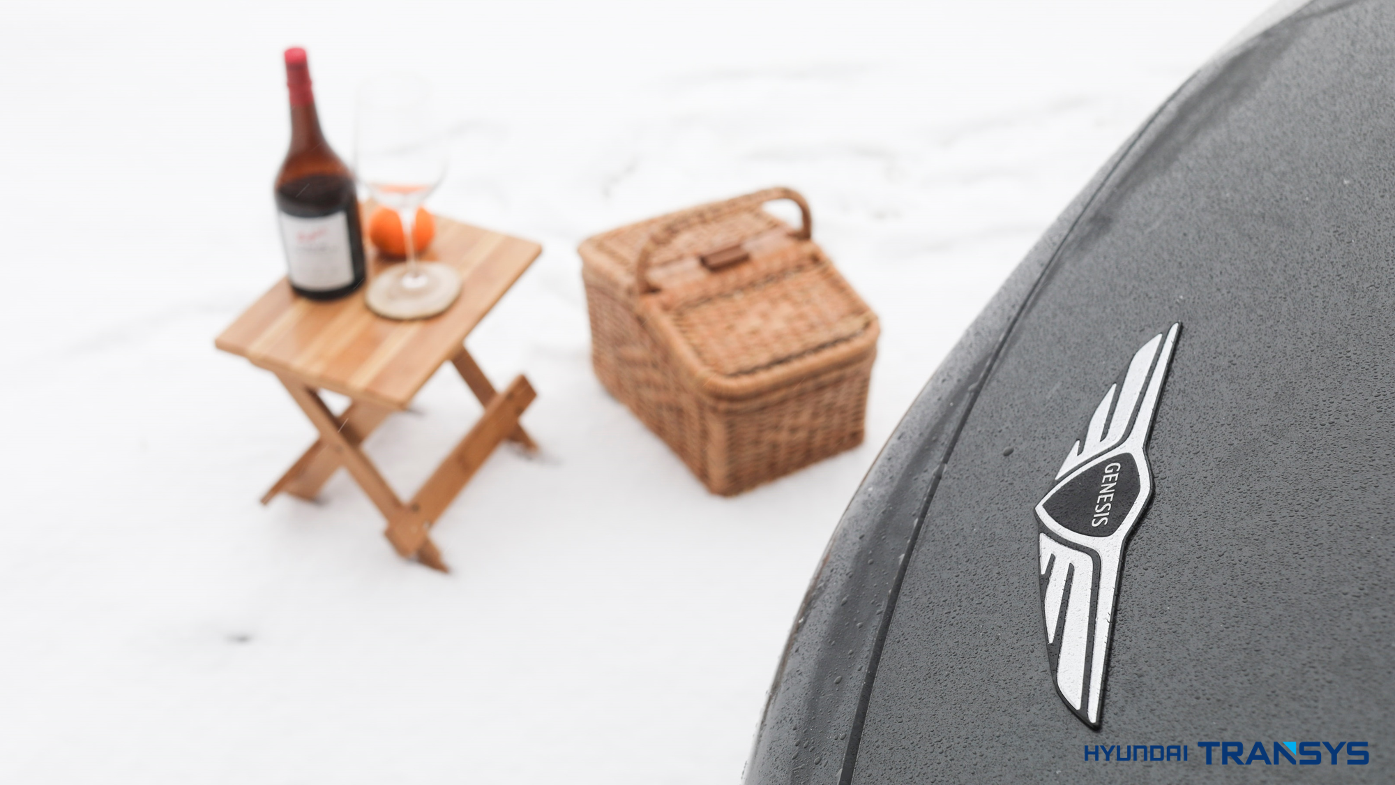 사실 제네시스 GV60을 만난다는 설레임에 전날 샌드위치 등을 넣은 피크닉 바구니와 촬영 소품으로 함께 할 와인까지 준비했는데요. 생각보다 많은 눈이 왔지만 또 그 나름대로의 운치를 느끼기 위해 준비한 피크닉 가방을 가지고 갔습니다.