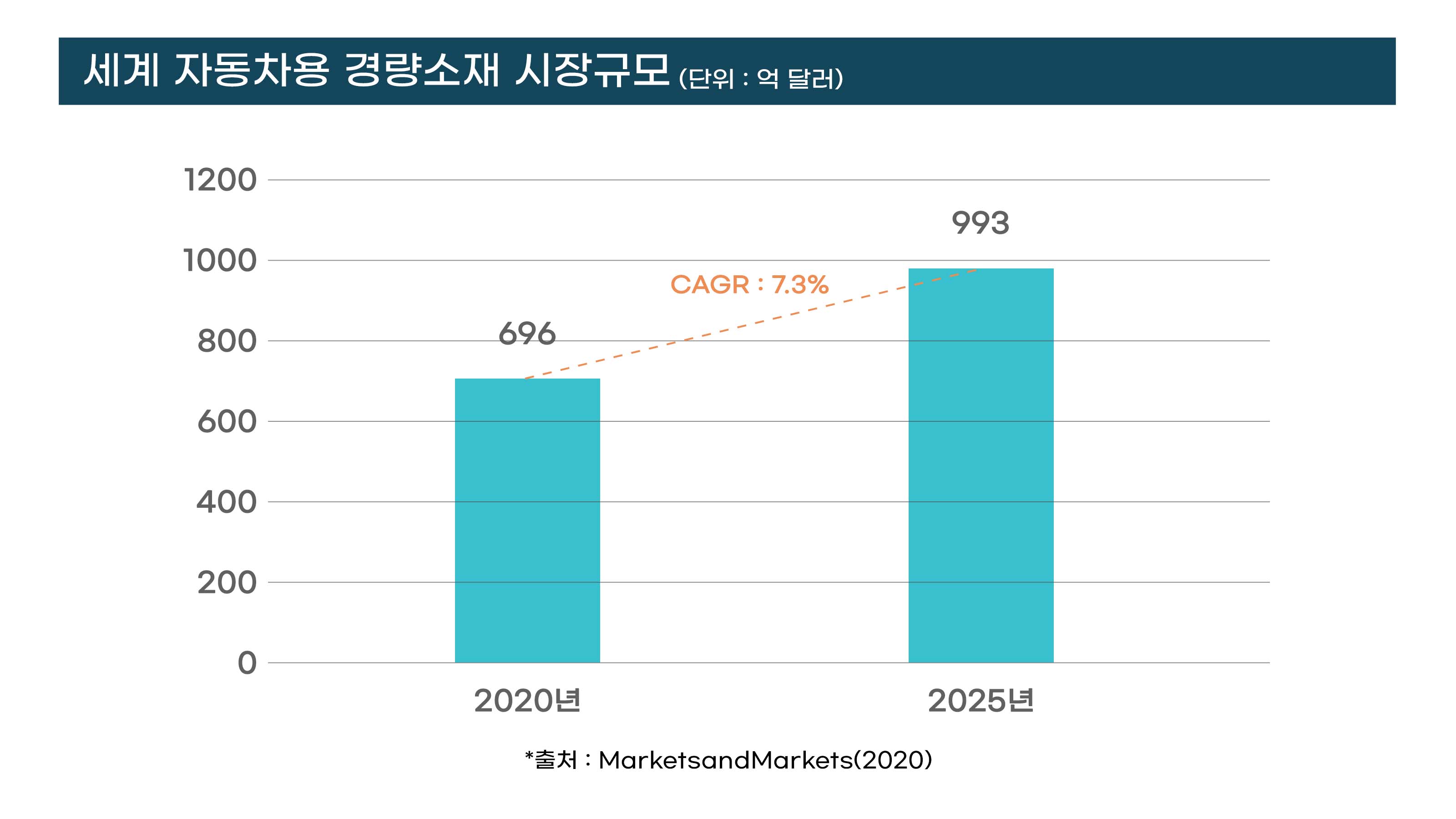 시장조사기관 마켓앤드마켓(MarketandMarkets)은 자동차용 경량 소재 시장이 2020년 696억 달러에서 연평균 7.3% 성장률을 보이며 2025년엔 993억 달러 규모의 시장을 형성할 것으로 예상했습니다.