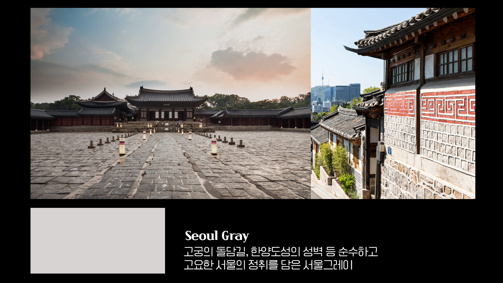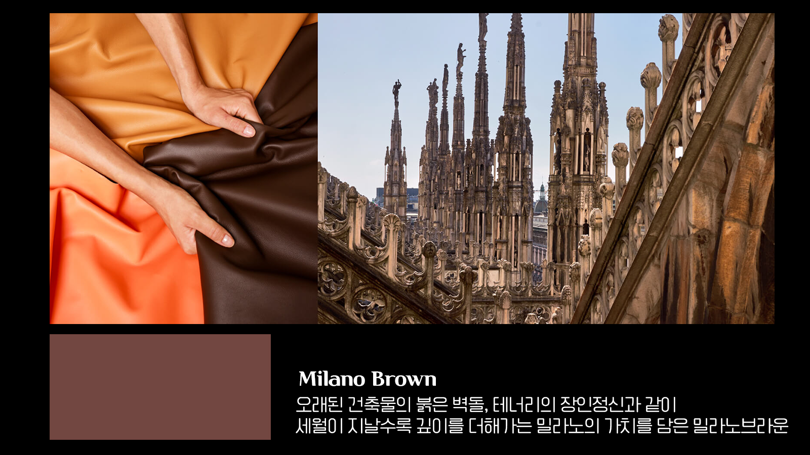 시트의 주요 색상은 고궁의 돌담길, 한양도성의 성벽 등 서울의 정취를 담은 ‘서울 그레이’와 밀라노의 붉은 건축물과 테너리(가죽가공업체)의 색상을 담은 ‘밀라노 브라운’으로 선택했습니다.