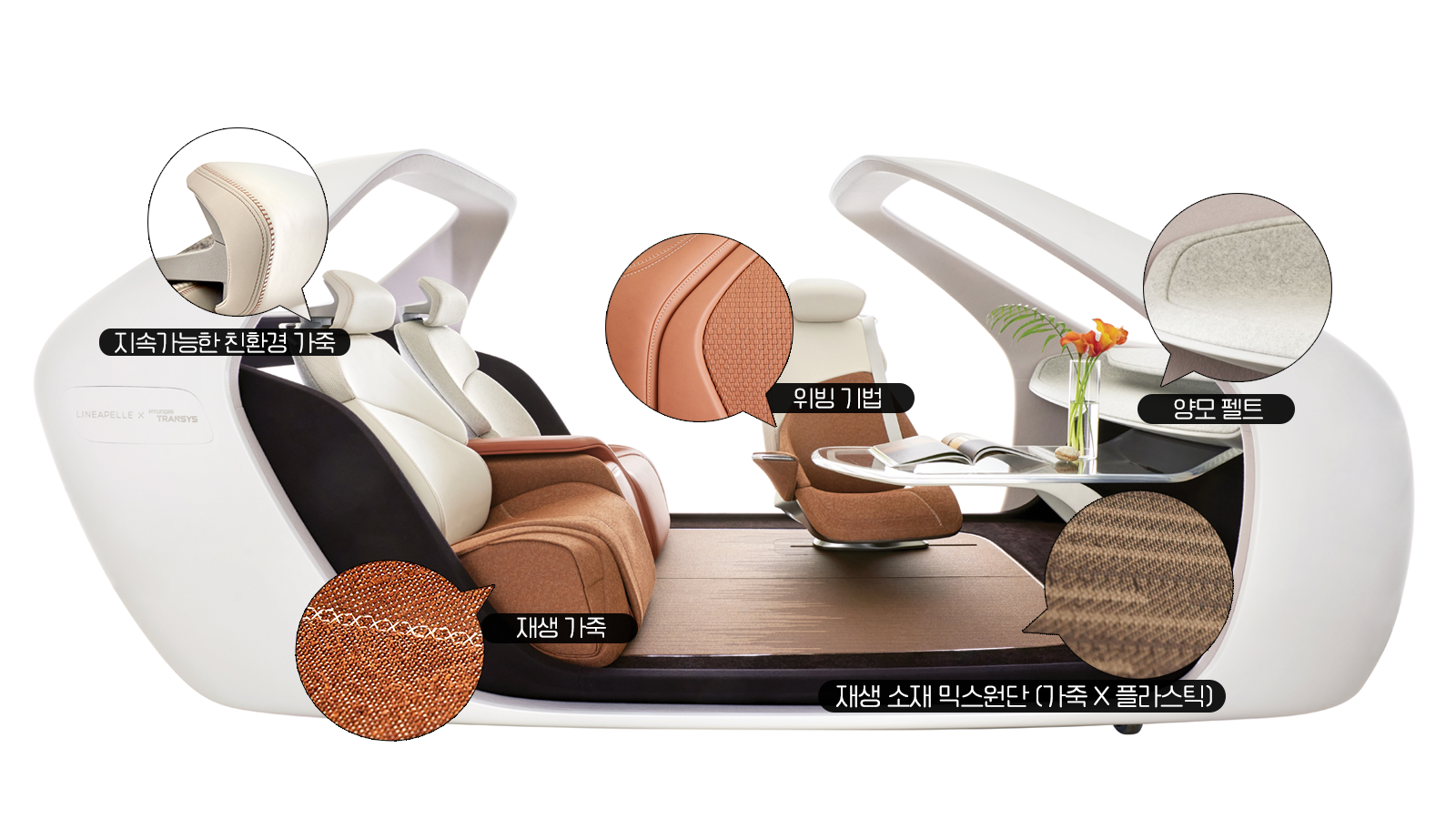 특히 지속가능한 방법으로 생산된 친환경 가죽과 폐가죽을 재활용한 재생가죽 등 다양한 친환경 소재를 적용했으며, 혁신적인 가공 기법을 통해 친환경 철학을 담은 현대트랜시스만의 신개념 모빌리티를 새롭게 정의했습니다.