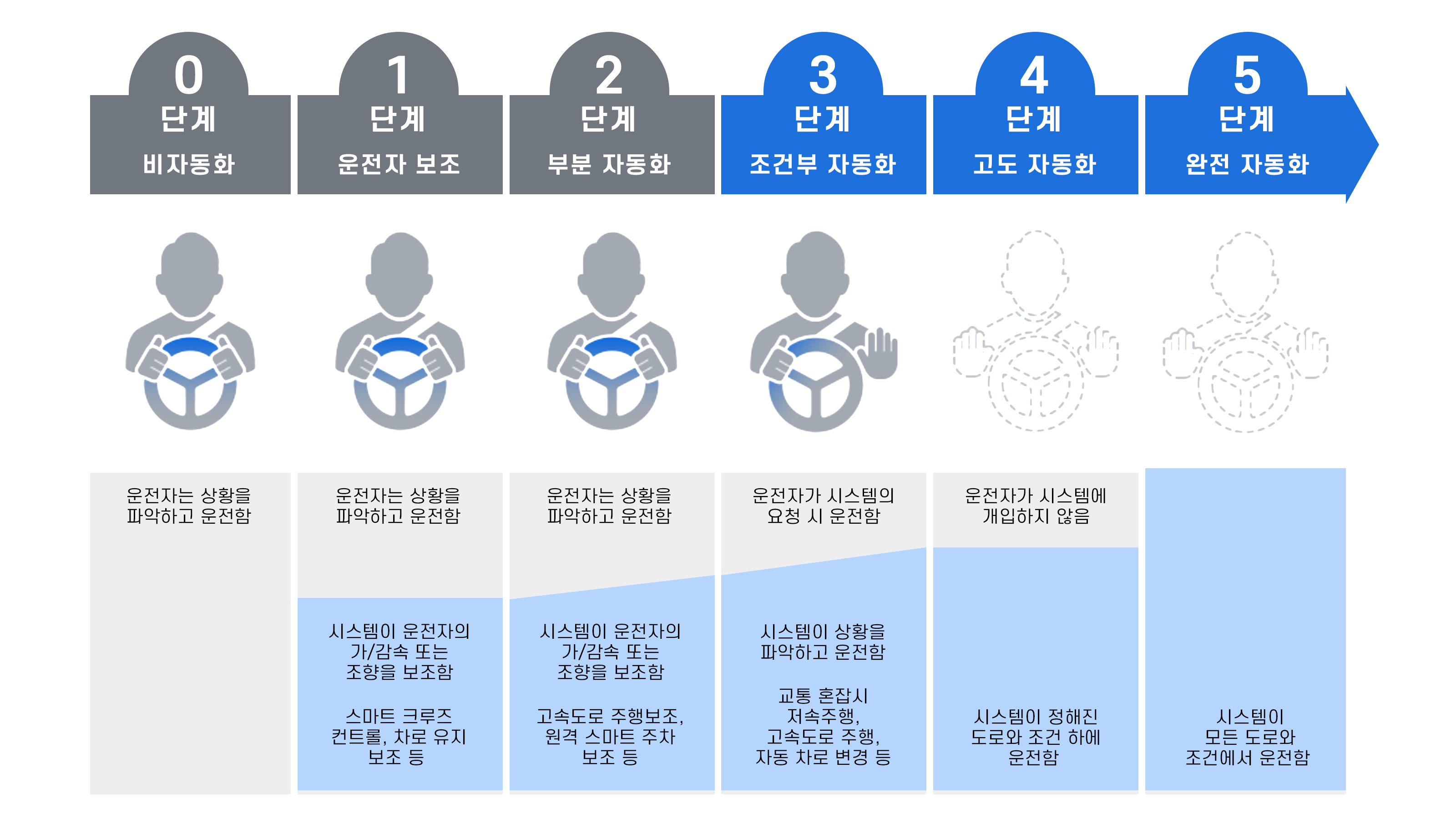 미국자동차공학회(SAE)는 자동차의 자율주행 단계를 기술 수준에 따라 6단계로 분류하고 있습니다. 현재 완성차에는 차량 스스로 속도와 제동을 제어하거나 방향을 바꿀 수 있지만 운전자의 통제가 필요한 2단계 수준이 기술이 적용되고 있는데요.