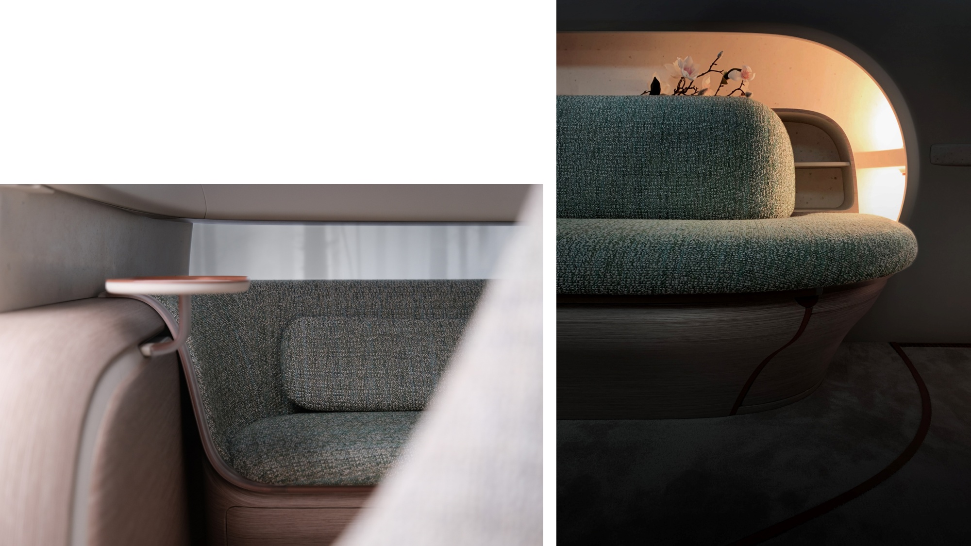 차량 내부는 180도 회전과 앞뒤 이동이 가능한 2개의 스위블링 라운지 체어와 1개의 라운지 벤치 시트를 적용했는데요. 상황에 따라 나란히 앉아 여행을 하거나 정차 또는 자율주행 시에는 서로 마주 보며 대화를 나눌 수 있게 되었습니다.
