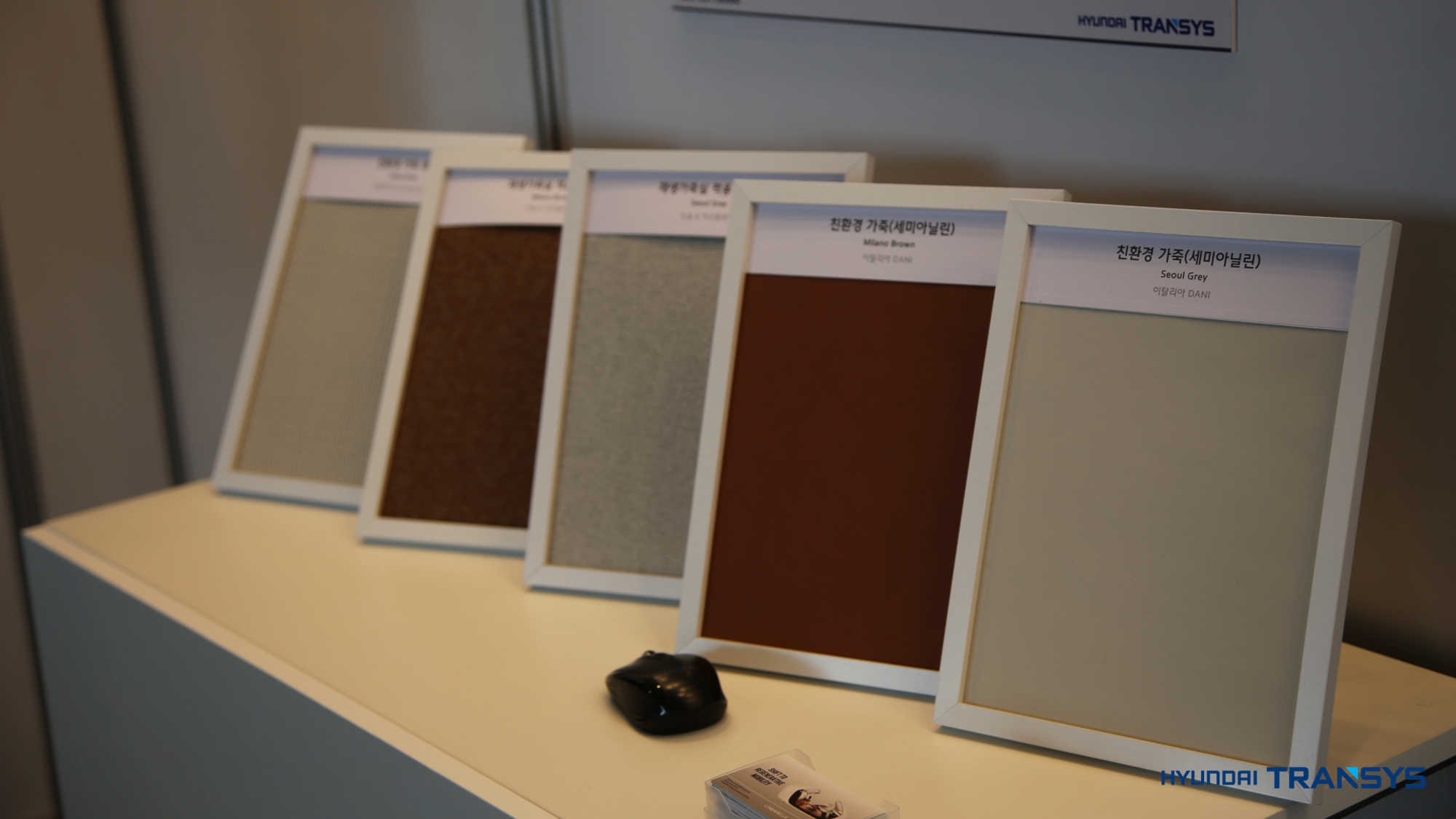 가장 먼저 친환경 존에서는 현대트랜시스는 지속가능한 가치를 소재에 반영한 친환경 시트 개발 방향성을 엿볼 수 있었습니다. 적외선 반사를 이용한 승온 저감 천연가죽부터 시트 오염 방지를 위한 커버링 소재 기술, 천연소재를 활용한 친환경 VOCs 저감 폼, 재생 가죽 등 친환경 소재를 적용한 모빌리티 공간이 조성되었습니다.