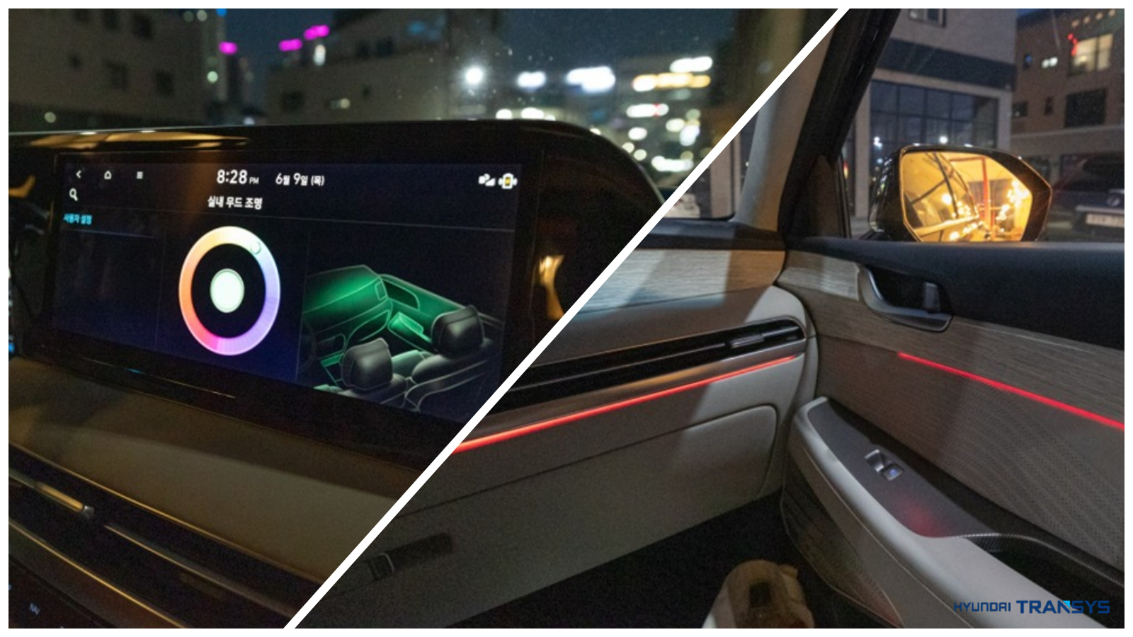 낮에는 잘 보이지 않던 실내 앰비언트 라이트도 궁금해서 저녁까지 주행을 해봤는데요. 색상은 몇 가지 한정적인 모드 중 고르는 것이 아니라, 원하는 색상으로 조합이 가능해요.