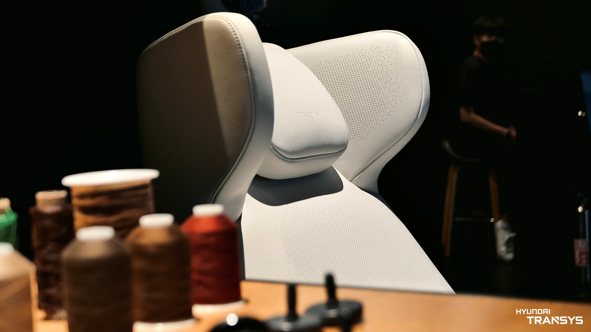 현대트랜시스 X 제네시스 리클라이닝 체어는 실제 차량에 사용되는 프라임 등급의 세미 애닐린 가죽과 컬러(글레이셔 화이트, 보르도 브라운)로 제작되어 1층 전시 공간과 제네시스 고객들을 위해 마련한 2층 오너라운지에서 만날 수 있습니다.