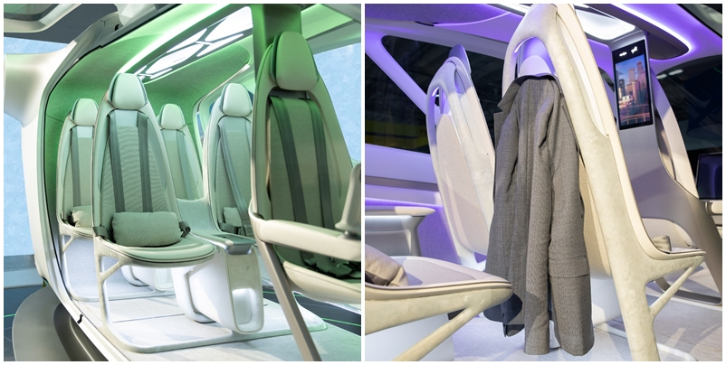 기체 내부를 살펴보면 자율주행 자동차처럼 앞뒤로 마주볼 수 있게 구성되어 있었습니다. 조종석과는 분리된 내부 공간으로 마치 소파를 그대로 옮긴 듯한 모습인데요. 넓고 편안한 거실처럼 구성되어 안락하게 이동하는 것에 초점을 둔 것으로 보이며, 마치 자율주행자동차의 컨셉시트 같은 느낌도 선사합니다.