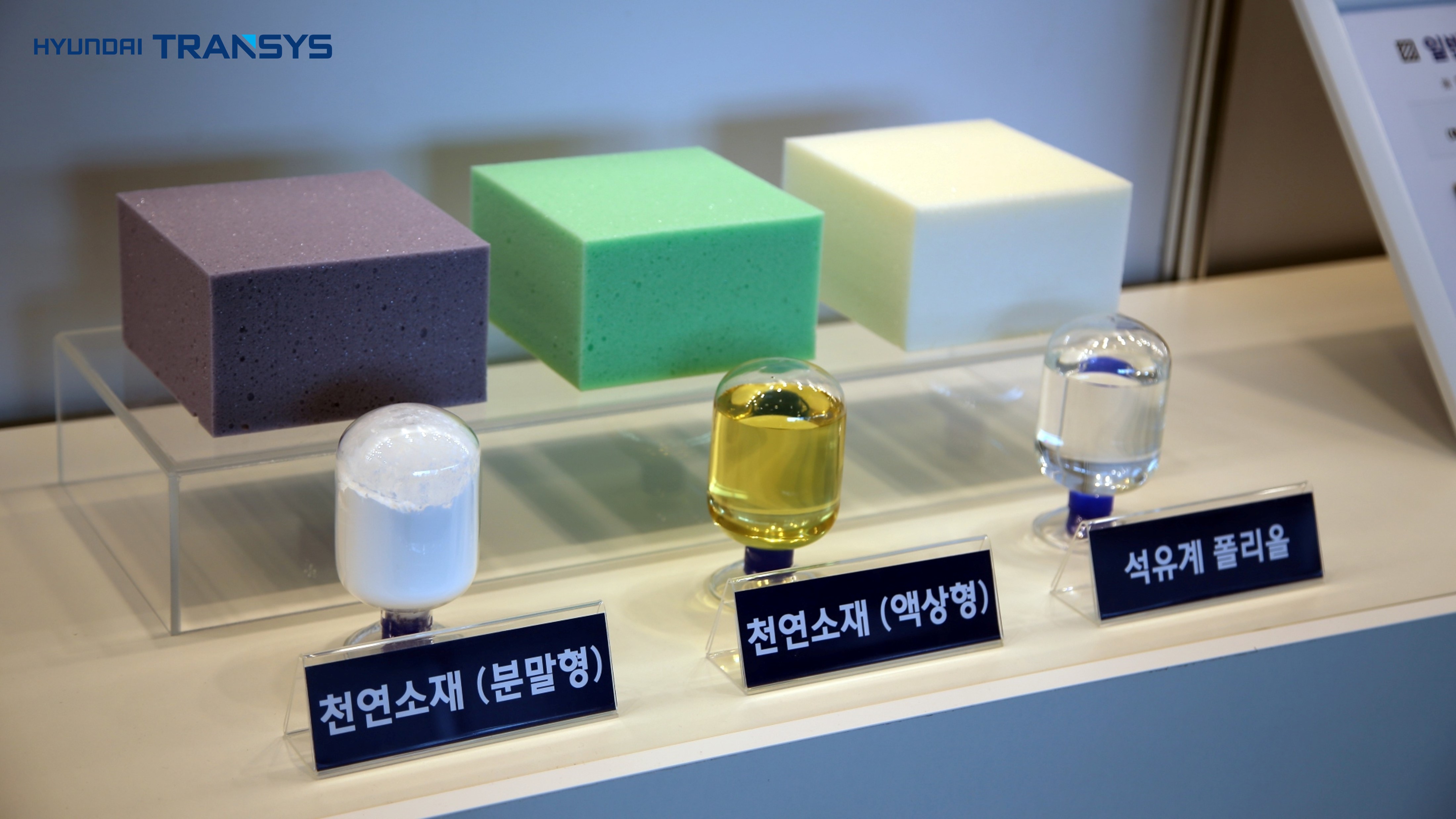 먼저 기존에 석유계 원재료로 만들어지던 시트커버와 폼을 옥수수와 피마자 열매 같은 천연 소재에서 추출한 바이오 매스로 대체했습니다. 바이오 매스는 연소 시 황산화물(SOx)이나 질소산화물(NOx), 이산화탄소 배출이 적은 친환경 에너지원으로 현대트랜시스는 이를 활용한 시트와 폼 개발을 지속적으로 확대하고 있습니다.