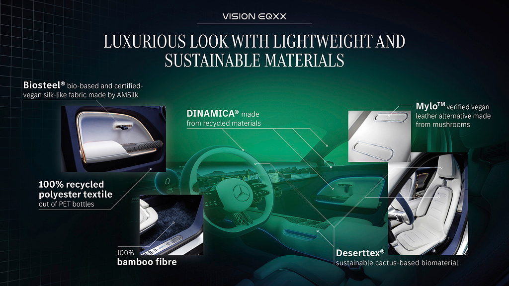 올해 공개한 순수 전기 콘셉트카 ‘비전 EQXX’에도 스타트업 기업에서 개발한 바이오 소재를 만나볼 수 있는데요. 도어 손잡이는 생분해되는 바이오 스틸 섬유로 만들어졌고, 시트엔 버섯과 선인장으로 만든 인조 가죽이 적용됐습니다. 바닥 매트는 빠르게 성장하고 재활용이 가능한 대나무 섬유로 제작되었습니다.