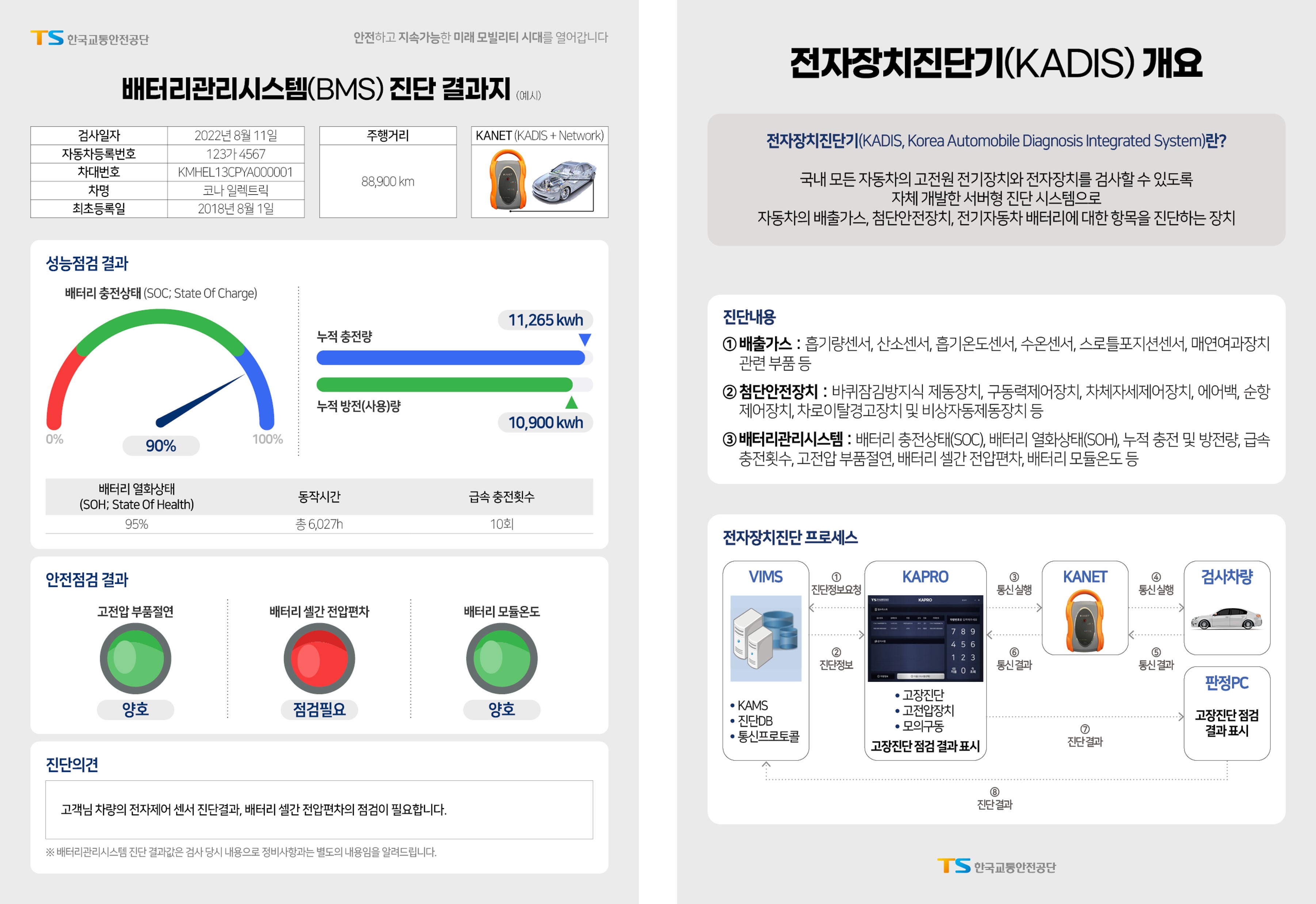 이 같은 현실을 반영해 한국교통안전공단은 올해 8월부터 자동차 정기 검사에서 전자장치진단기를 활용해 ‘전기차 배터리 성능 및 안전 진단 서비스‘를 제공하기 시작했습니다.