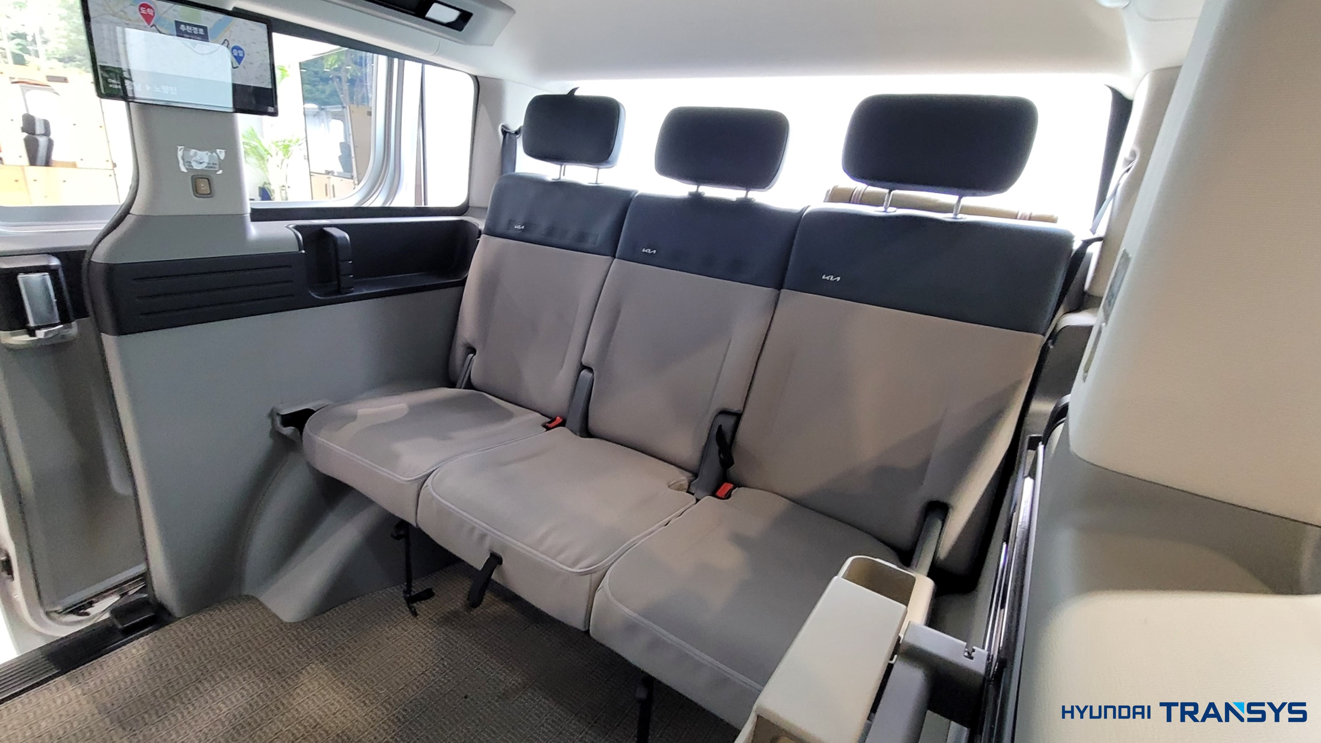 후석은 접이형 좌석 2개와 마주보는 형태의 벤치형 좌석 3개로 이루어져 5명이 탑승할 수 있도록 구성했습니다. 뒤를 돌아있는 형태로 설치된 접이형 좌석은 시트를 살짝 옆으로 이동시켜 승객 간 어깨를 편하게 둘 수 있게 개발했으며, 시트를 폴딩하면 해당 공간에 우산과 같은 짐을 거치할 수도 있습니다.