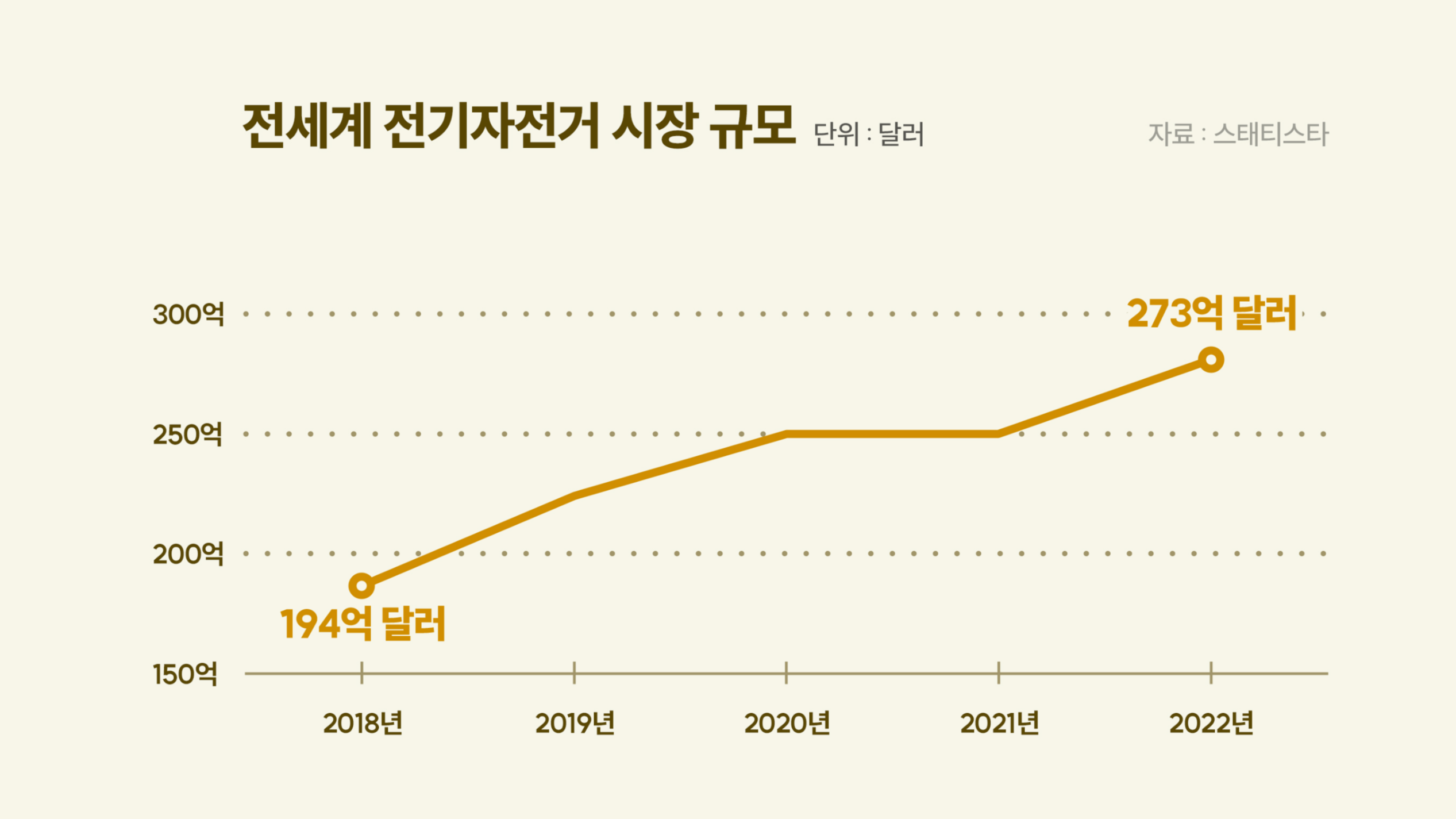 시장조사기관 스태티스타는 2019년 212억 달러(약 30조 원)였던 전 세계 전기 자전거 시장 규모가 올해 273억 달러(약 39조 원)으로 커졌고, 2025년에는 361억 달러(약 52조 원)에 이를 것으로 전망했습니다. 판매 대수도 크게 증가해 유럽자전거산업연맹(CEBI)은 유럽의 전기 자전거 시장 규모가 2025년까지 약 700만 대 규모로 성장할 것이라고 밝혔습니다.