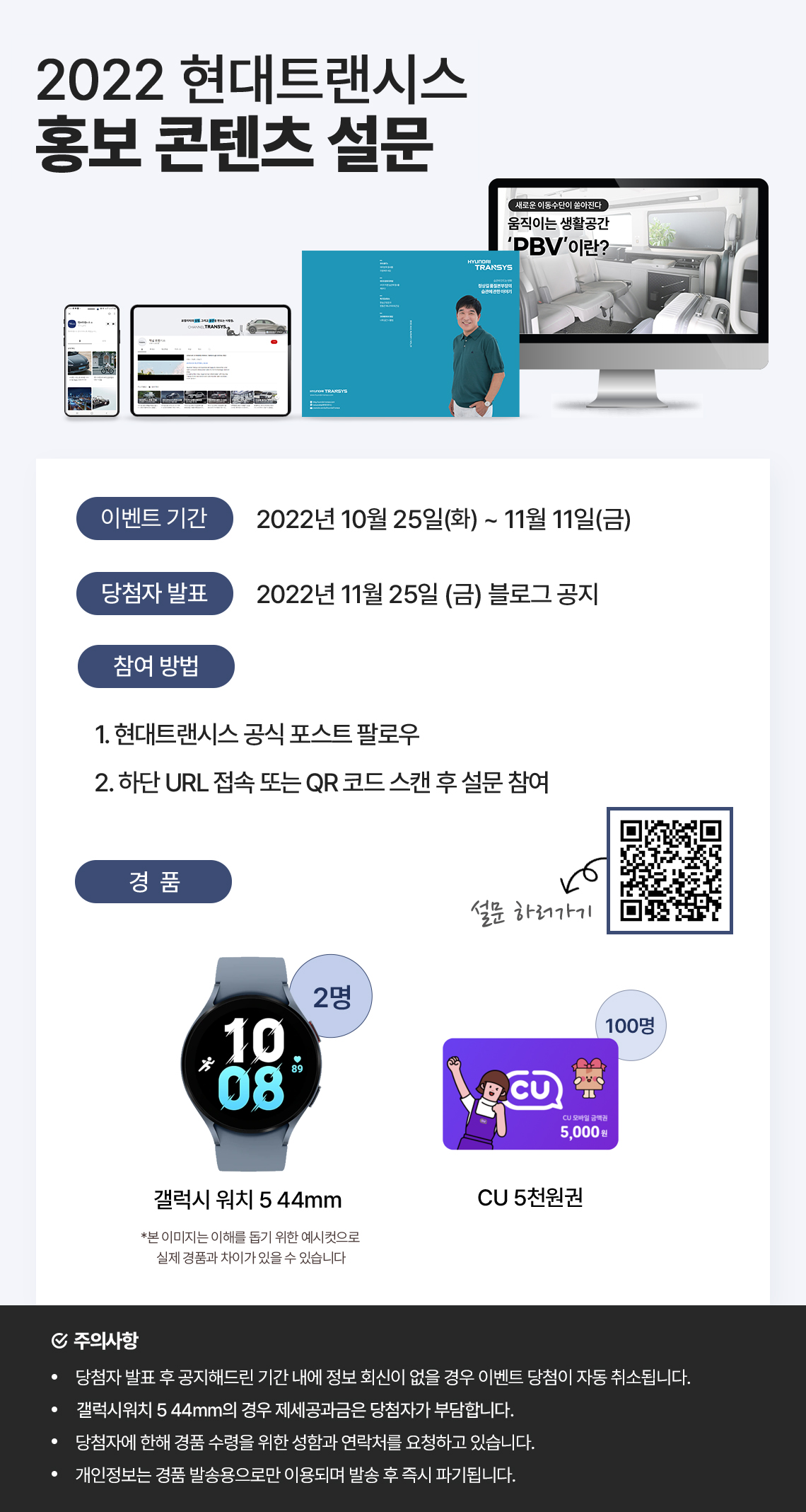 하단 링크 또는 QR코드를 통해 <2022년 현대트랜시스 홍보콘텐츠> 설문조사를 진행하시면 됩니다.
