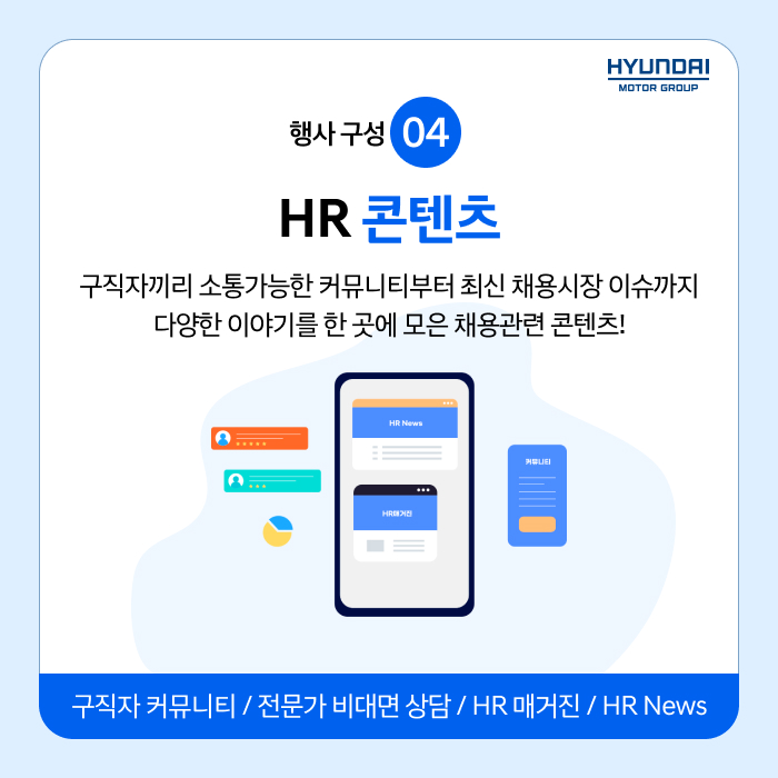 ‘HR 콘텐츠’ 탭에서는 커리어, 업무, 취미 등 다양한 정보를 공유하는 직장인 커뮤니티, 자유로운 대화를 통해 혼자서 해결하기 어려운 업무 고충을 해소하는 전문가 컨설팅, 인사관리부터 채용동향까지 인사 담당자를 위한 심층 매거진, 최신 채용 이슈부터 놓치기 아까운 정부 정책까지 한 곳에 모은 뉴스레터 등도 운영합니다.
