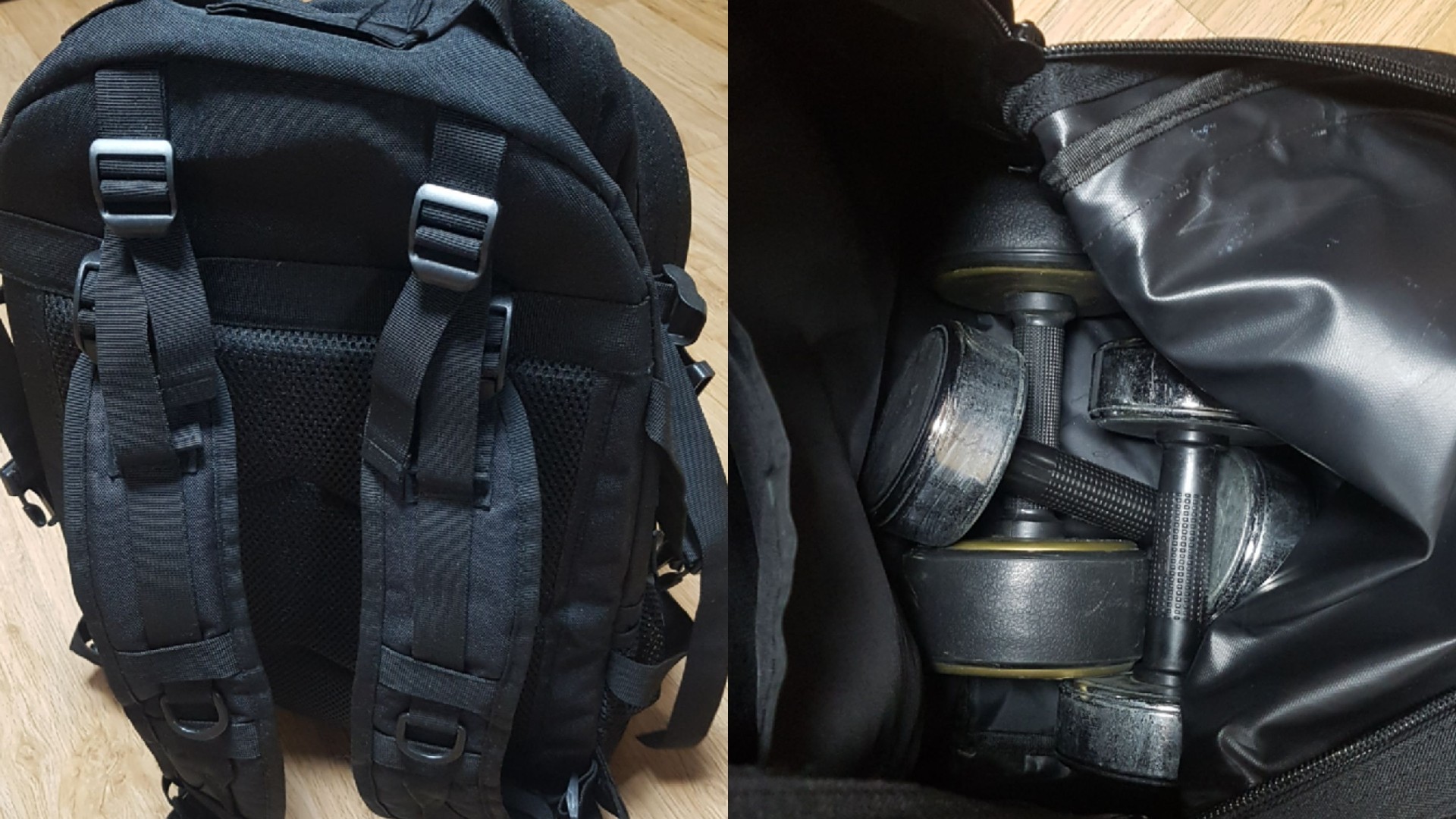 턱걸이는 등 운동 시 항상 빼먹지 않고 수행하는 루틴인데요. 컨디션에 따라 맨몸으로 진행할 수도 있지만 보다 묵직한 부하를 느끼고자 한다면 잘 쓰지 않는 가방과 덤벨을 이용하면 됩니다. 만약 덤벨이 없다면 전공 책, 생수통, 벽돌과 같이 무게가 나가는 물건으로 대체 가능합니다.