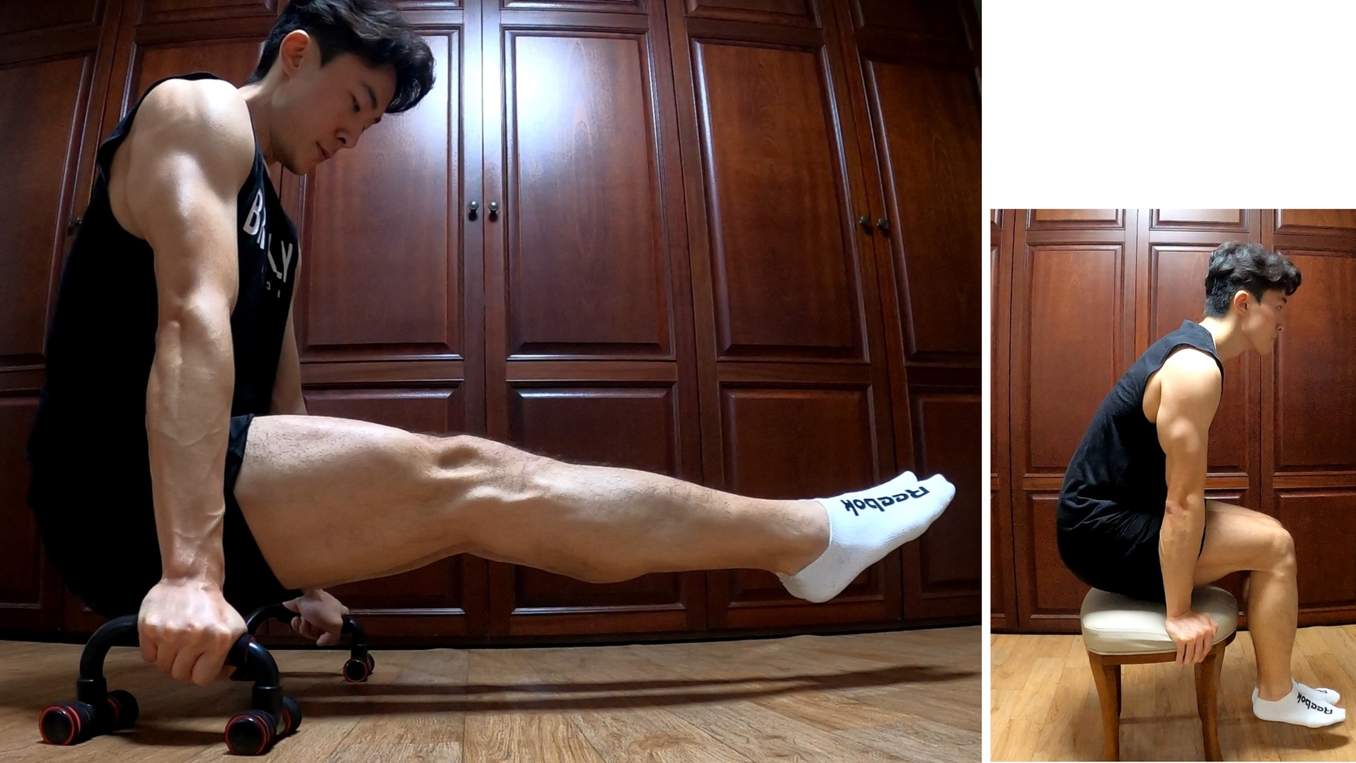 저는 손목 부하 경감과 몸통과 바닥 사이 거리 확보를 위해 푸쉬업 바를 썼는데 맨바닥이나 두꺼운 책을 쌓아서도 수행할 수 있습니다. 엘싯이 어렵다면 의자를 이용하여 턱 엘싯이라는 동작으로 대체할 수도 있습니다.