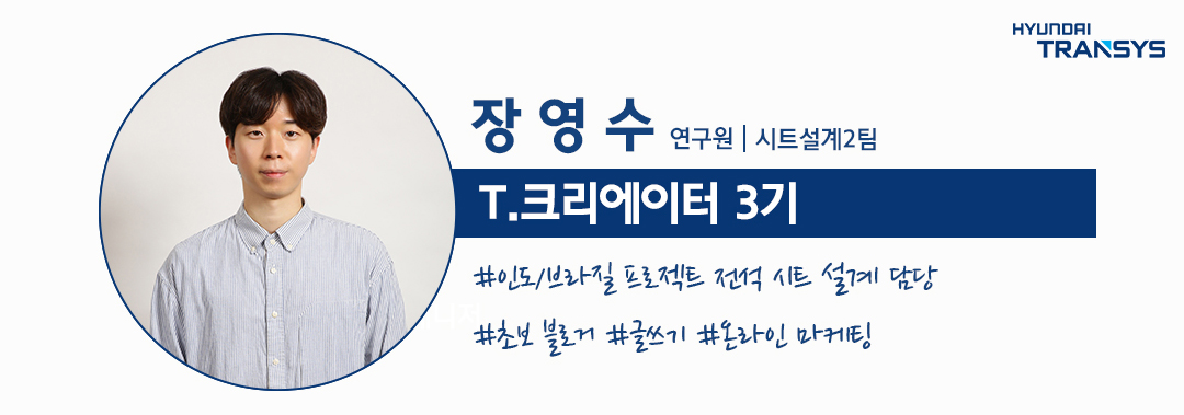 안녕하세요, 현대트랜시스 시트설계2팀에서 근무하고 있는 장영수 연구원입니다. 현대트랜시스는 전동화 파워트레인과 자율주행자동차 시트 사업을 중심으로 미래 모빌리티 시장의 핵심 기술을 선도하고 있는데요.