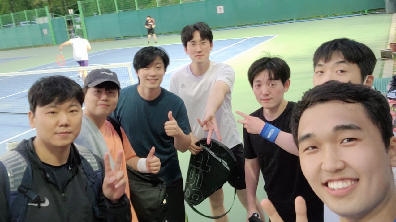현대트랜시스 사내 테니스 동호회 멤버입니다. 요즘은 테니스의 인기가 많아져서 예약에 어려움을 겪고 있지만 가끔씩 이렇게 모여 함께 땀 흘리며 테니스를 치곤 한답니다. 실력은 비밀이지만 다들 일취월장 중인 만큼 기대가 되는 멤버들인데요. 다들 언젠가 패더러와 나달을 꿈꾸며 라켓을 휘두르고 있답니다.