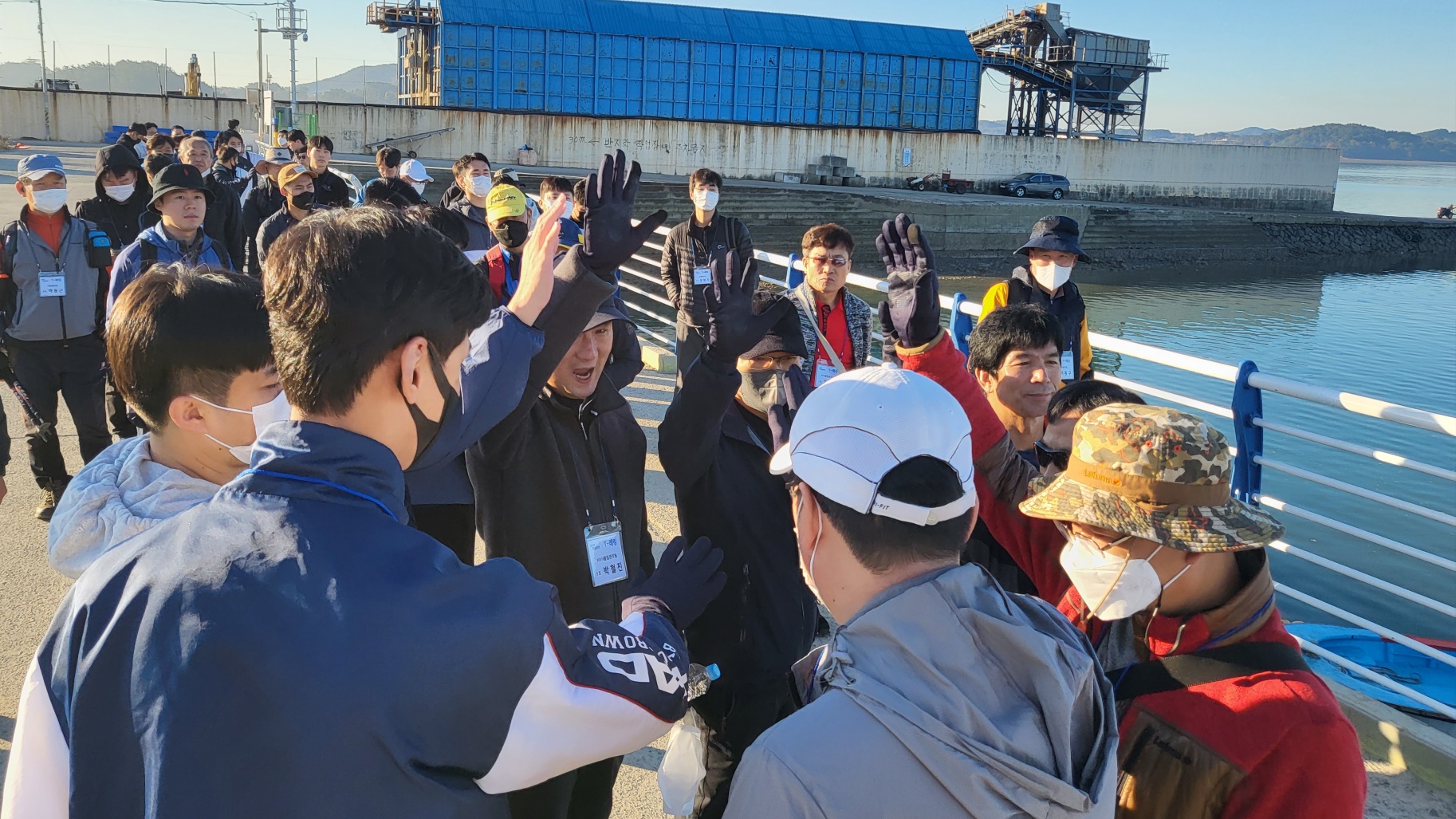행사 당일 현대트랜시스 성연공장 임직원들은 배차된 버스에 탑승해 트레킹 시작 장소인 구도항으로 이동했습니다. 구도항에 집결한 후에는 각자 트레킹에 필요한 물품과 등산 장갑을 지급받았습니다.