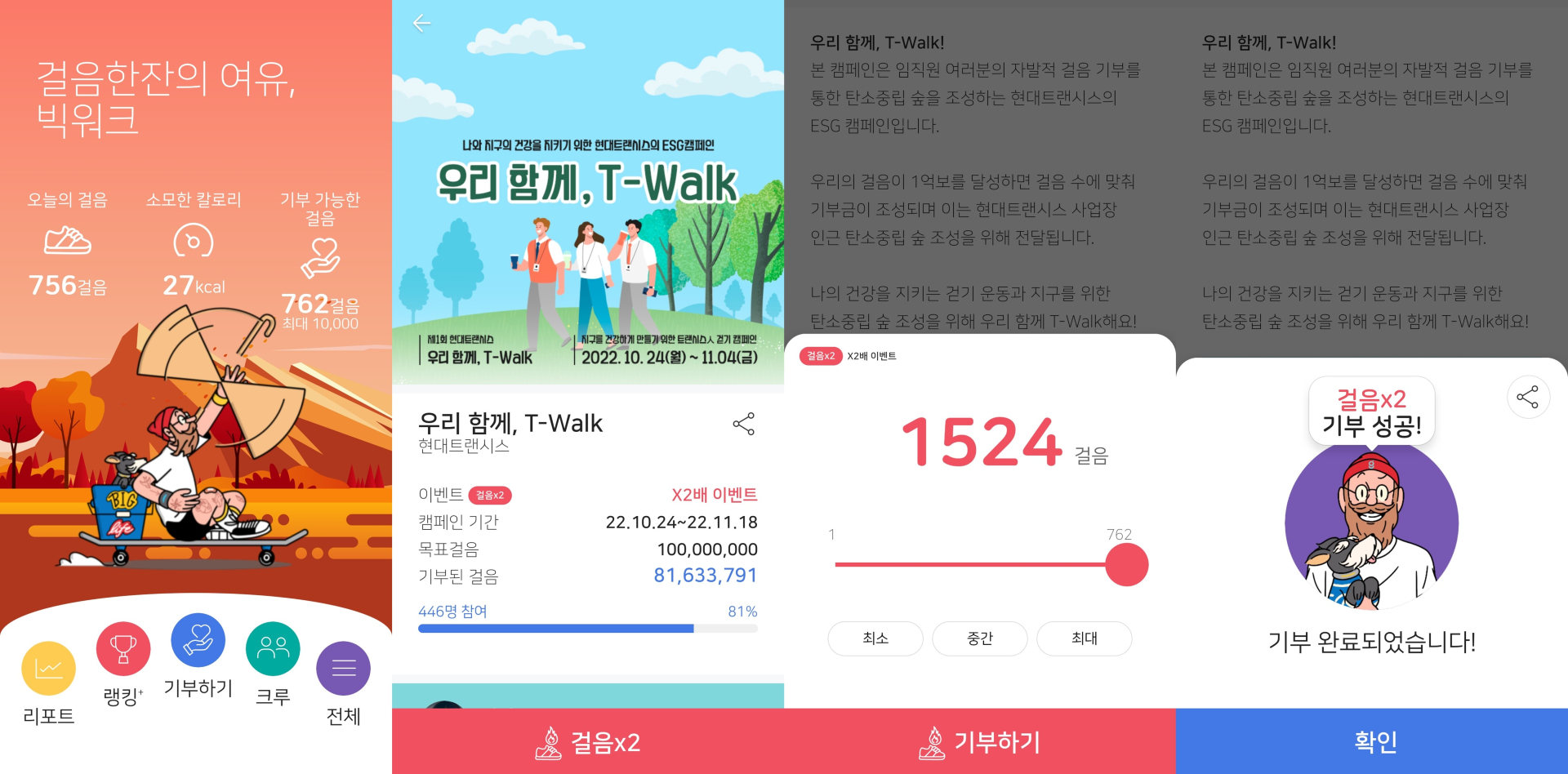 ‘우리 함께, T-walk’ 캠페인은 임직원들이 스마트폰에 걷기 전용 어플리케이션을 설치하고 걷기 캠페인에 동참하면, 임직원들의 걸음 수만큼 기부금을 축적하는 참여형 사회공헌 활동입니다. 특히 일상생활 속 걷기 실천을 통해 직원들의 건강도 챙기고, 탄소중립도 실천할 수 있어 많은 분들이 동참해 주셨는데요.