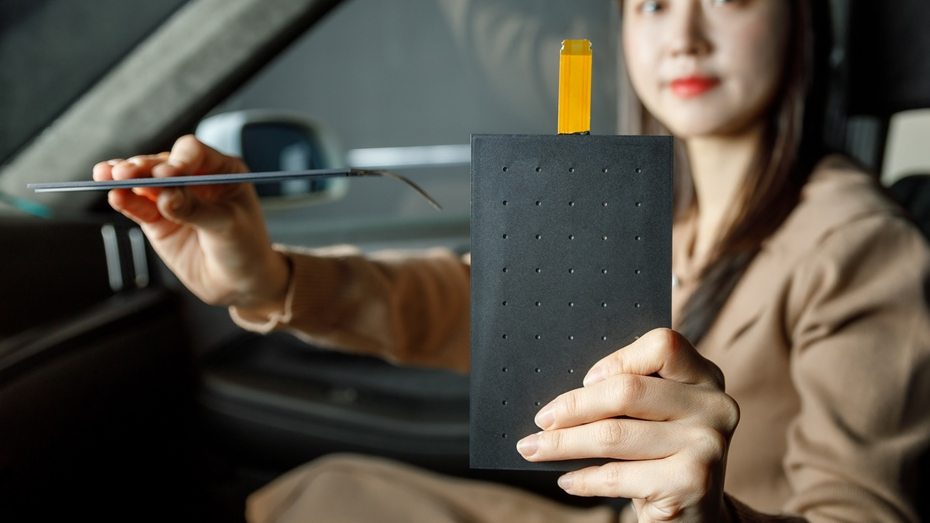 차량용 사운드 솔루션은 LG디스플레이가 독자 개발한 필름 형태의 진동 발생 장치가 디스플레이 패널이나 차량 내장재를 진동판 삼아 소리를 내는 방식인데요. 크기는 여권과 비슷하고 두께는 500원짜리 동전과 비슷하며, 무게는 40g으로 기존 자동차 스피커의 30% 수준입니다.