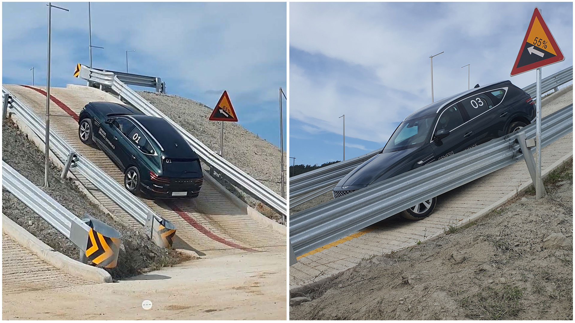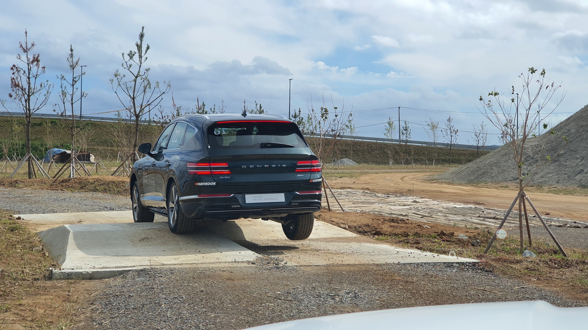 가장 먼저 체험한 범퍼 코스는 뒷바퀴 하나가 뜨는 구조로 범퍼 정상에서는 대각선의 두 바퀴만 지면에 닿아 있게 됩니다. 물론 멈추지 않고 주행한다면 관성 때문에 AWD가 아닌 차량들도 해당 코스를 지나 갈 수 있겠지만, GV80은 공중에 떠 있는 바퀴를 인지하고 지면에 닿아 있는 바퀴에만 구동력을 전달하여 헛도는 것 없이 안정적으로 지나갈 수 있었습니다.