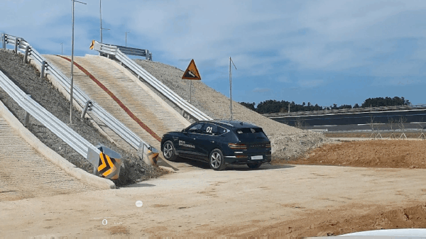 측면경사로는 위로 솟은 도로와 아래로 꺼진 도로 두 가지로, 경사에 진입해 있을 때는 괜찮지만 진입할 때와 벗어날 때 모두 바퀴 하나가 허공에 뜨게 되는데요. 이때도 범퍼 코스와 같이 지면에 닿아 있는 바퀴에만 구동력을 전달해주어 안정적으로 코스를 통과할 수 있었습니다.