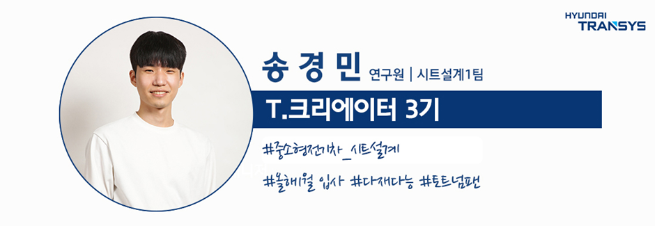 안녕하세요 저는 현대트랜시스 시트설계1팀에서 근무하고 있는 1년차 신입연구원 송경민입니다.