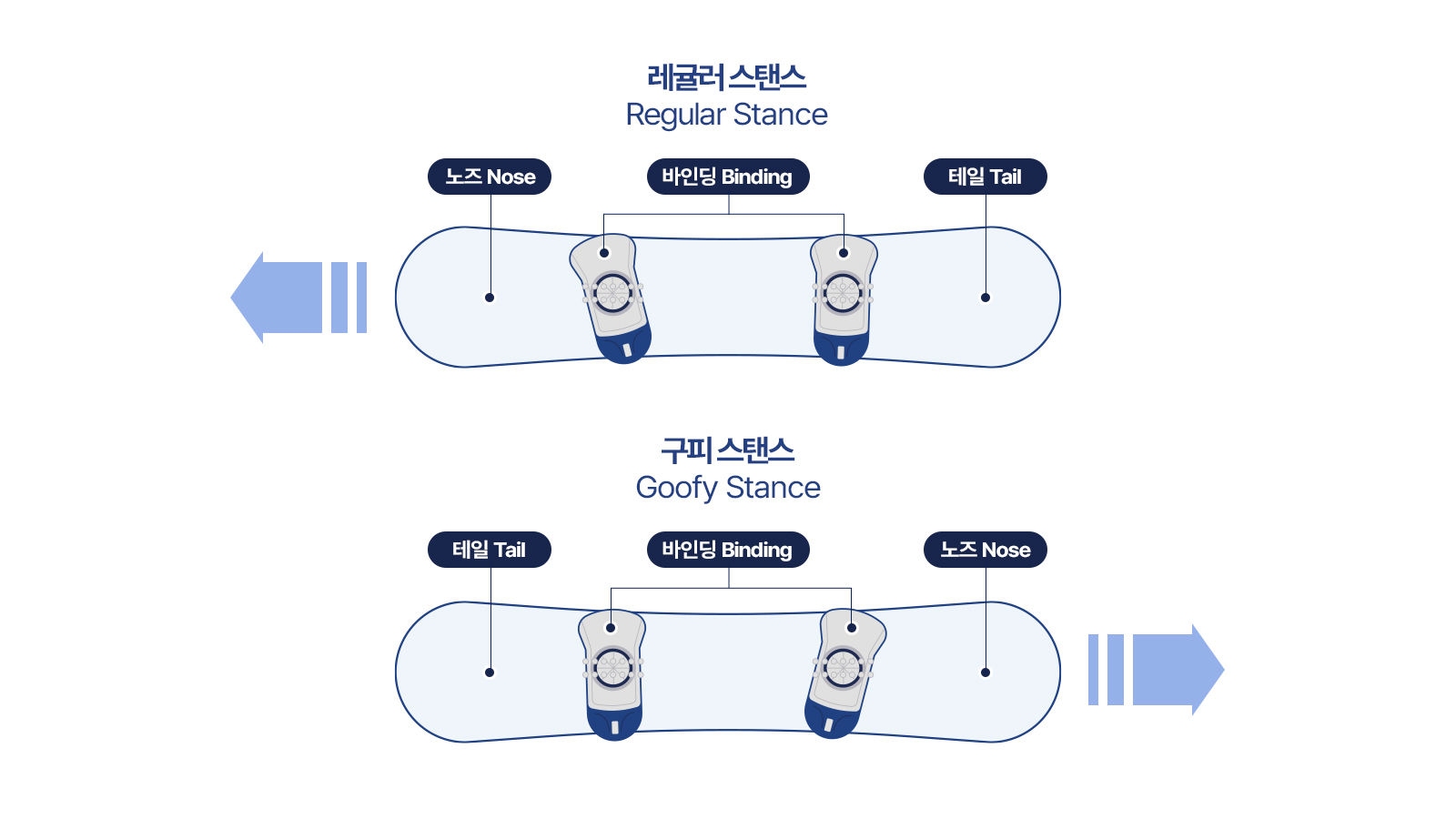 자신에게 알맞은 스탠스를 찾기 위해서는 가장 익숙한 발이 진행 방향의 뒤쪽에 위치하게 두면 좋습니다. 뒷발을 사용하여 보드를 미세하게 컨트롤하기 때문이죠. 일반적으로 오른손잡이인 경우 오른발이 주 사용 발이기 때문에 레귤러, 왼손잡이인 경우 왼발이 주 사용 발이기 때문에 구피로 보시면 됩니다.