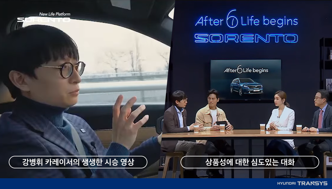 이번 온라인 론칭 토크쇼 ‘쏘렌토 톡톡’은 오프라인에서만큼 4세대 쏘렌토를 생생하게 느낄 수 있도록 다양한 콘텐츠로 기획된 것이 특징입니다. 신차 공개, 자동차 전문가들의 차량 설명, 김병휘 카레이서의 시승 영상, 패널 토크쇼, 다양한 SNS 인증 이벤트까지 담았으며 3만 6000여 명이 시청할 만큼 주목을 받은 온라인 론칭 쇼였죠.