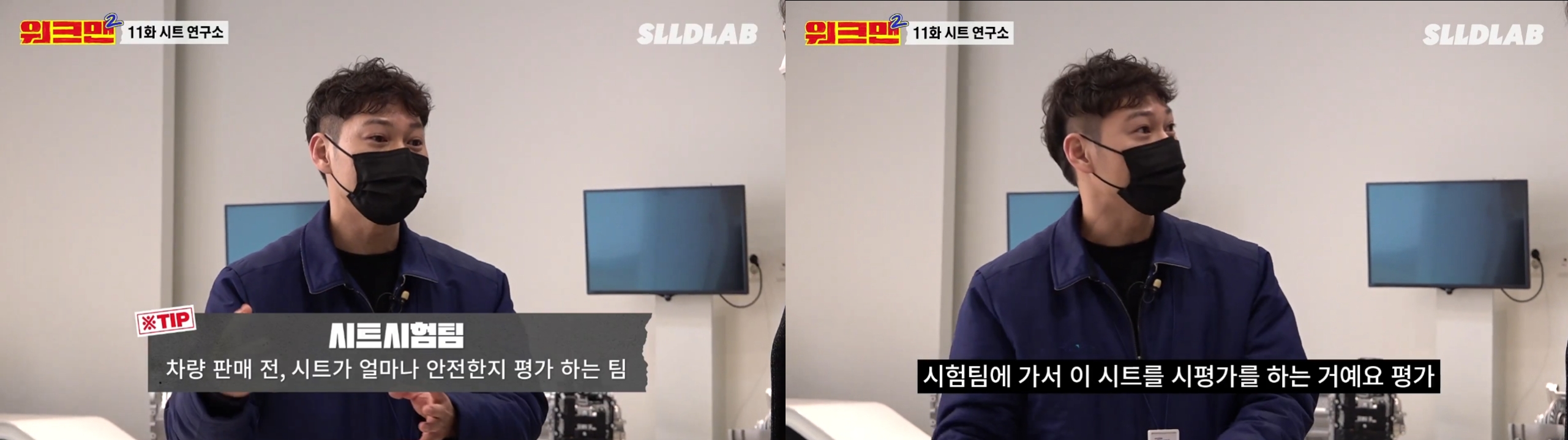 지난 1월 13일 공개된 <11화 시트 연구소> 편에서는 현대트랜시스 동탄 시트 연구 센터에 방문해 소리만 듣고 데시벨이 얼마인지 맞추는 ‘소리의 달인’ 전설의 워크맨과 티격태격 대환장 케미를 선보이며 웃음 버튼을 자극했습니다.
