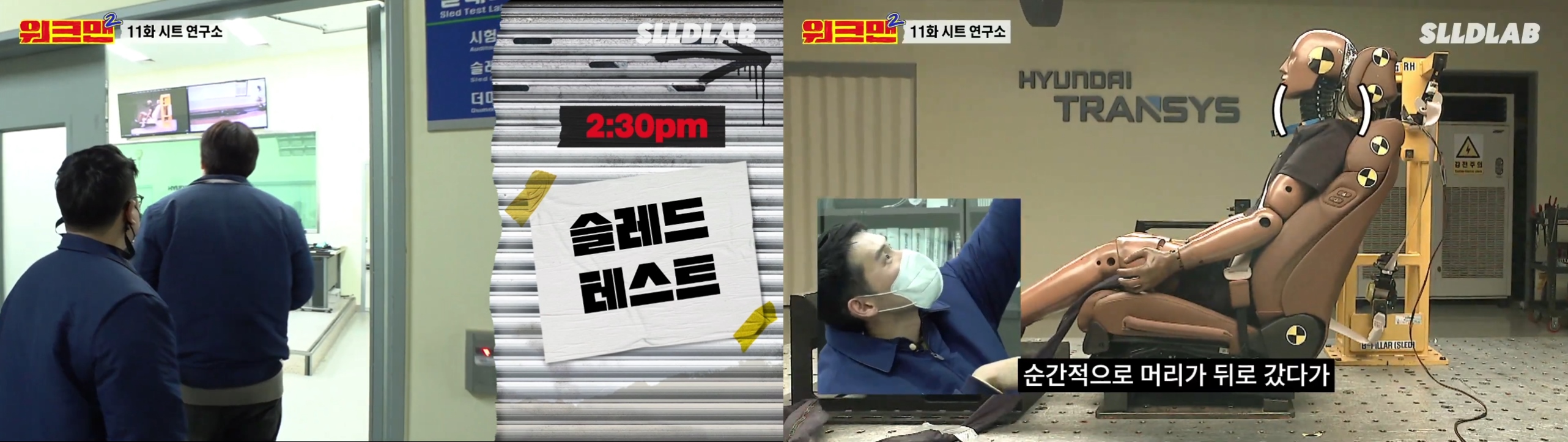 다음으로는 레일 위에 시트와 더미를 장착하고 다양한 충돌사고를 재현해 안전성을 평가하는 슬레드 시험을 진행했는데요. 사고 발생 시, 시트가 외부 충격으로부터 탑승자를 안전하게 보호할 수 있도록 충돌 시 탑승자에 가해지는 충격을 고속카메라로 촬여하고 더미의 손상을 파악해 개선하는 시험입니다.