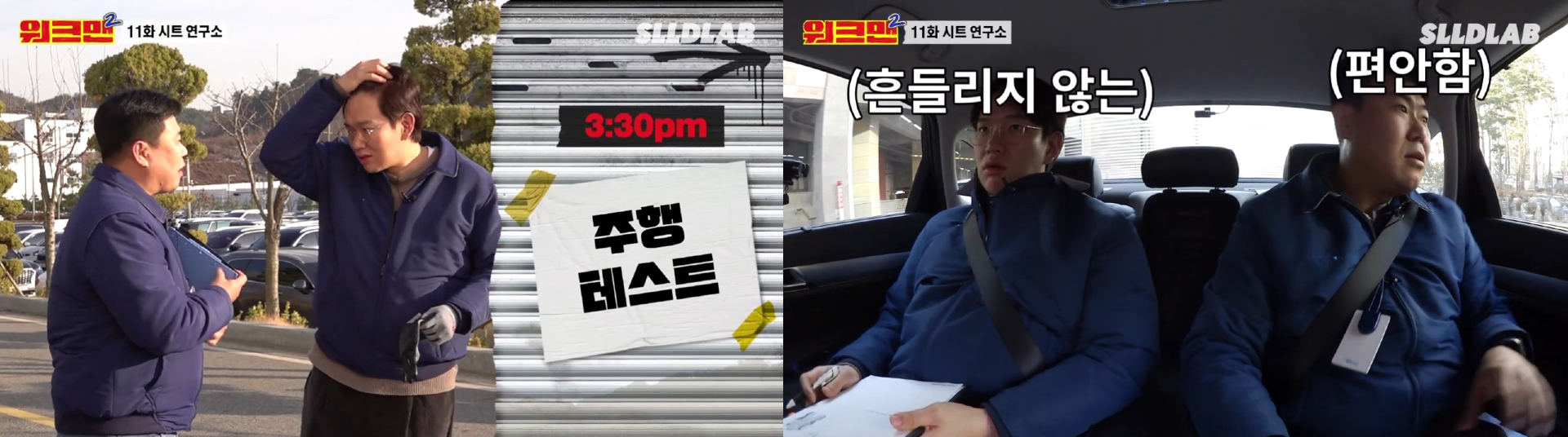 마지막으로는 실제 차량 주행을 통해 탑승자의 입장에서 시트를 평가하는 실차 주행 테스트를 진행했습니다. 급정거, 급커브 등 주행하며 만날 수 있는 다양한 환경을 통해 시트의 안전성 평가했는데요. 주행 내내 장성규는 ‘잠이 폭풍으로 쏟아진다’, ‘흔들리지 않는 편안함을 몸소 느꼈다’라며 칭찬을 아끼지 않았습니다.