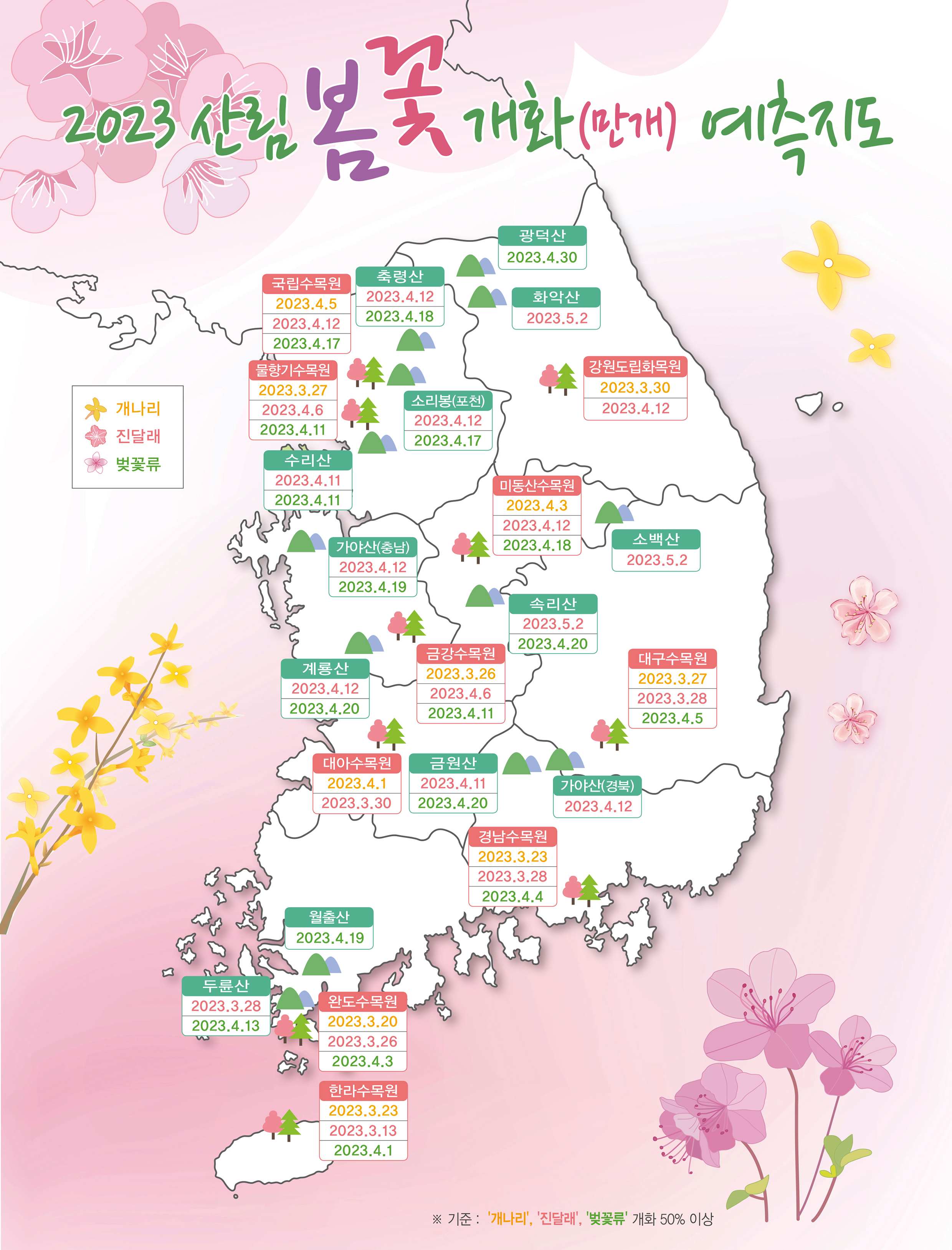 따뜻한 봄 날씨가 계속되면서 봄꽃 개화시기에 대한 관심이 높아지고 있는데요. 지난 3월 산림청이 발표한 ‘2023년 봄꽃 개화 예측지도’에 따르면, 올해 봄꽃은 지역과 수종에 따라 다소 차이는 있겠지만 진달래를 시작으로 개나리, 벚꽃 순으로 핀다고 합니다.