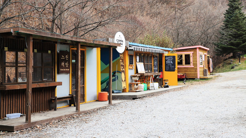 이름에 걸맞게 울창한 나무 그늘과 시원한 계곡바람을 만끽할 수 있으며, 캠핑장 내 마련되어 있는 ‘느린책방’에서는 책을 읽으며 여유를 즐기기 적합하죠. 장부에 이름을 적으면 책을 빌려갈 수도 있습니다.